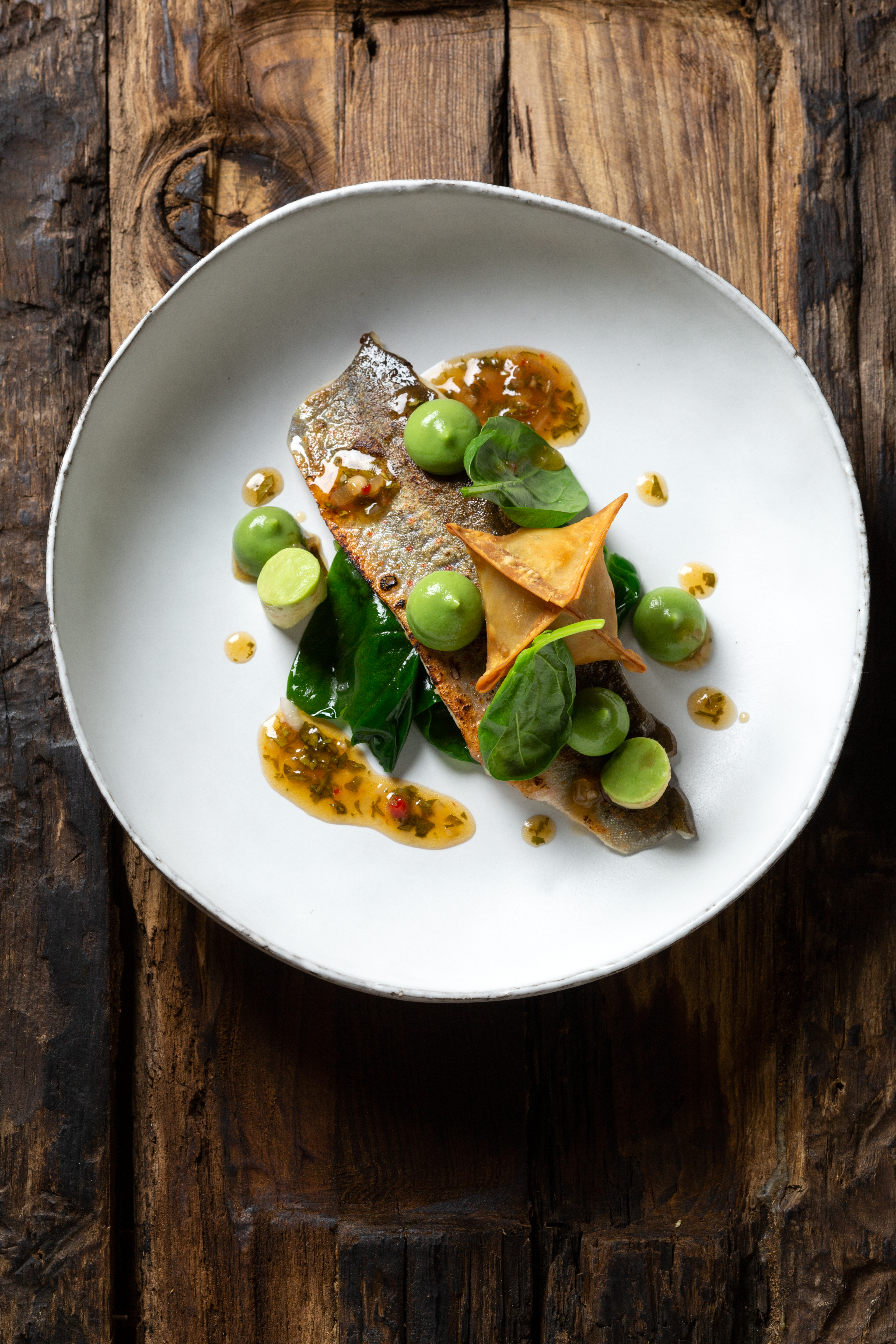 Gebratenes Doradenfilet & Garnelen Wan Tan Beilagen: Babyspinat, Avocado, Koriander Chilli Vinaigrette