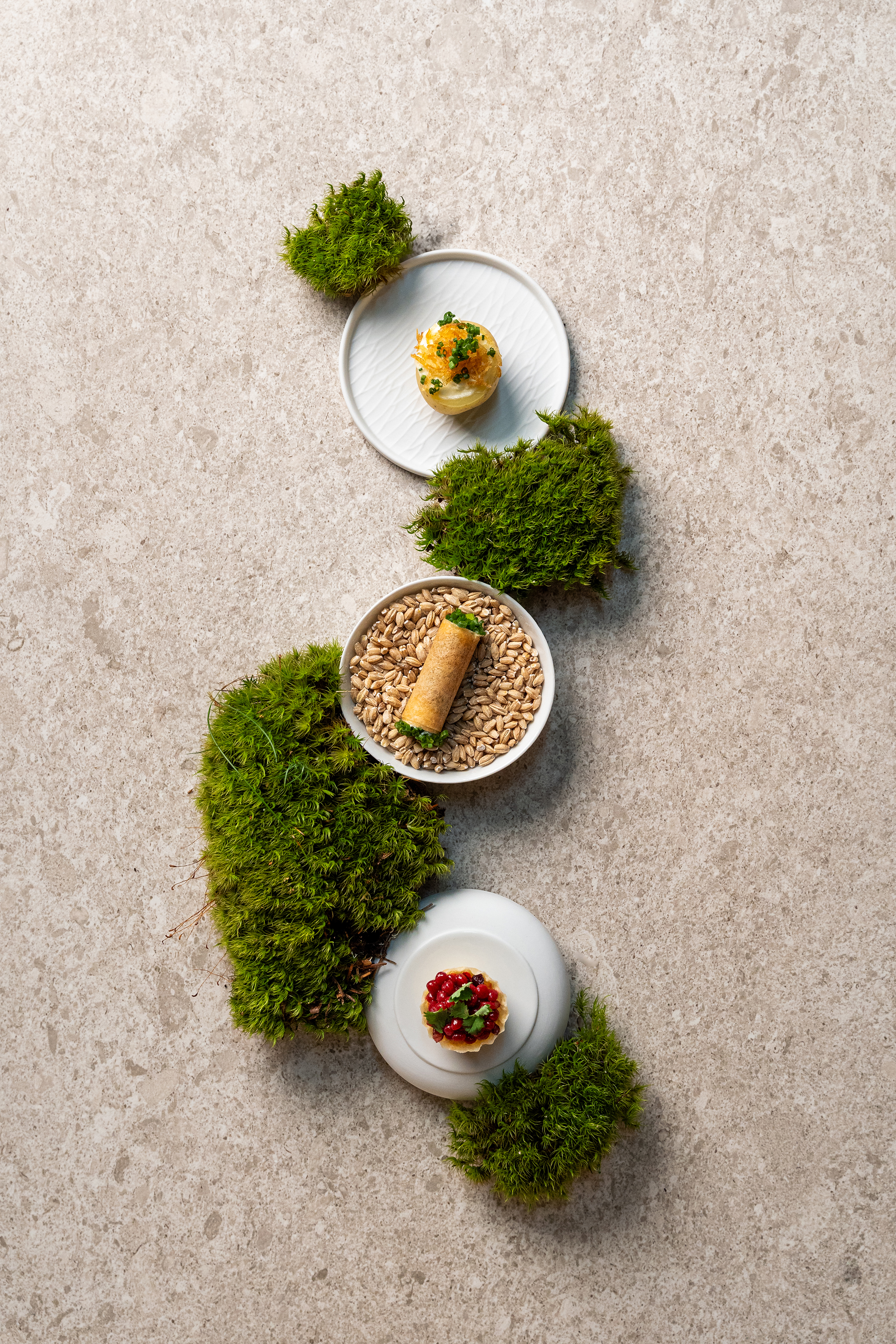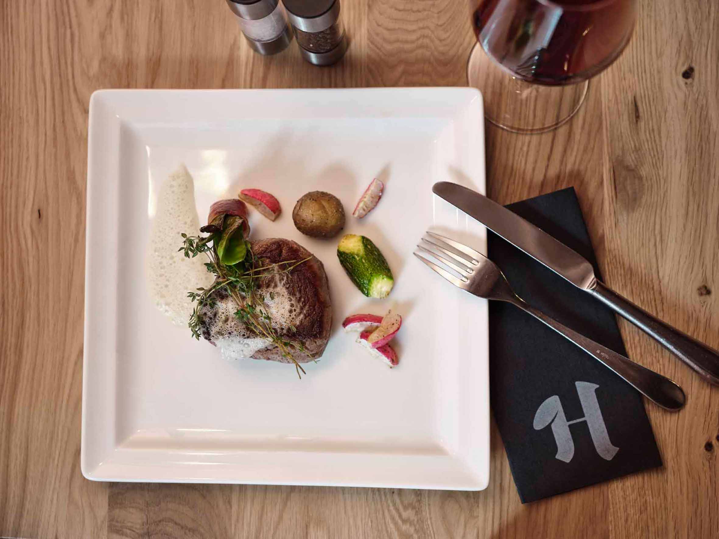 Gericht aus Rind-Radieschen-Zuchini-Schaum
