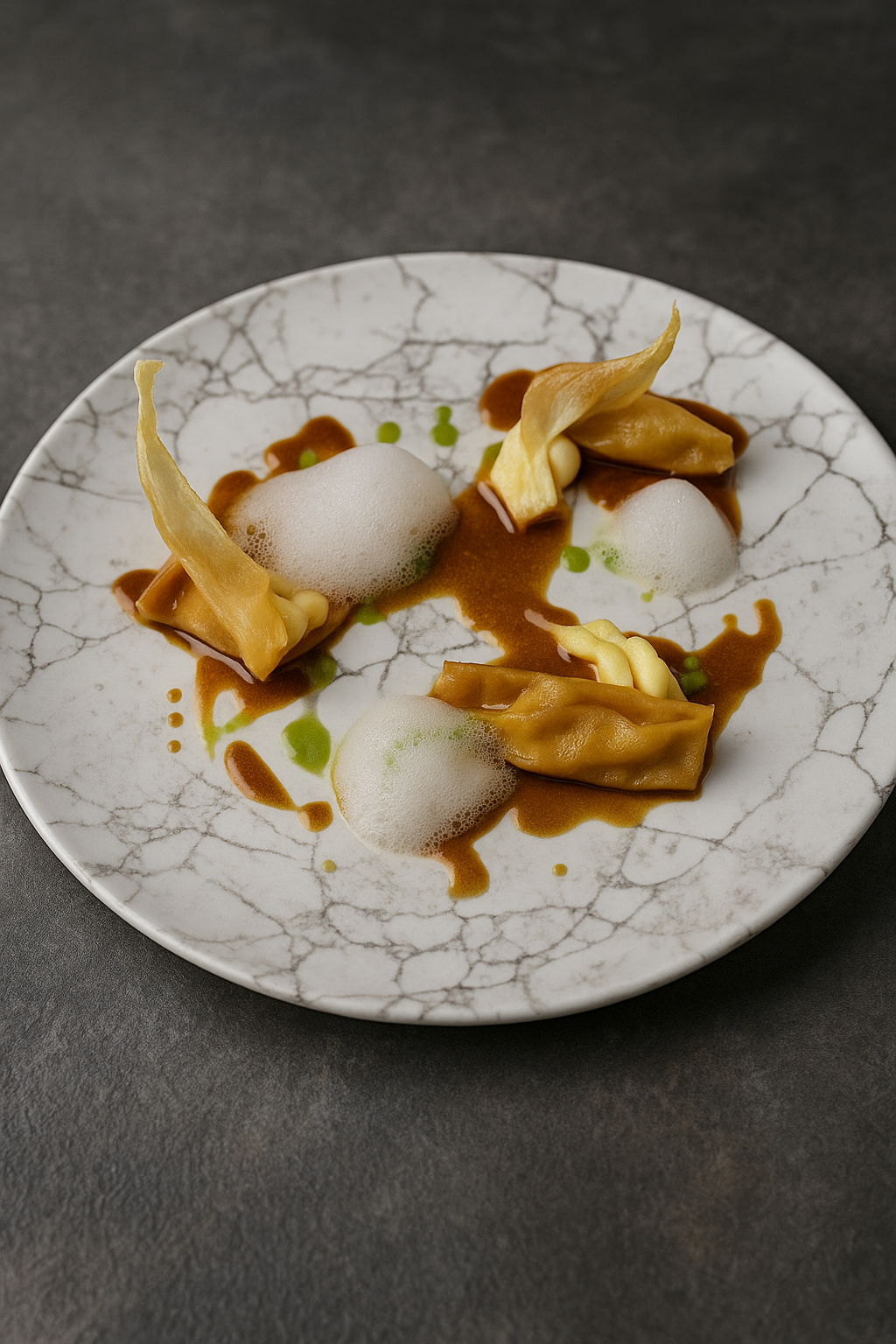 Schweineravioli | Sellerie | Gochangsauce | Tomatenwasser
