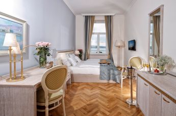 Im Stil der Belle Epoque 1895 erbaut und nach umfangreicher Renovierung 2014 in der Holleis-Hotelgruppe neu eröffnet, versetzt das Grand Hotel seine Besucher in eine andere Zeit. 114 stilvolle Zimmer und Suiten vereinen mondänen k.-u.-k.-Schick mit zeitgemäßem 4-Sterne-Komfort. Eleganter Wellnessbereich mit finnischer Sauna, Behandlungsangebot, Hallenbad und beheiztem Salzwasser-Außenpool lädt zum Entspannen ein.