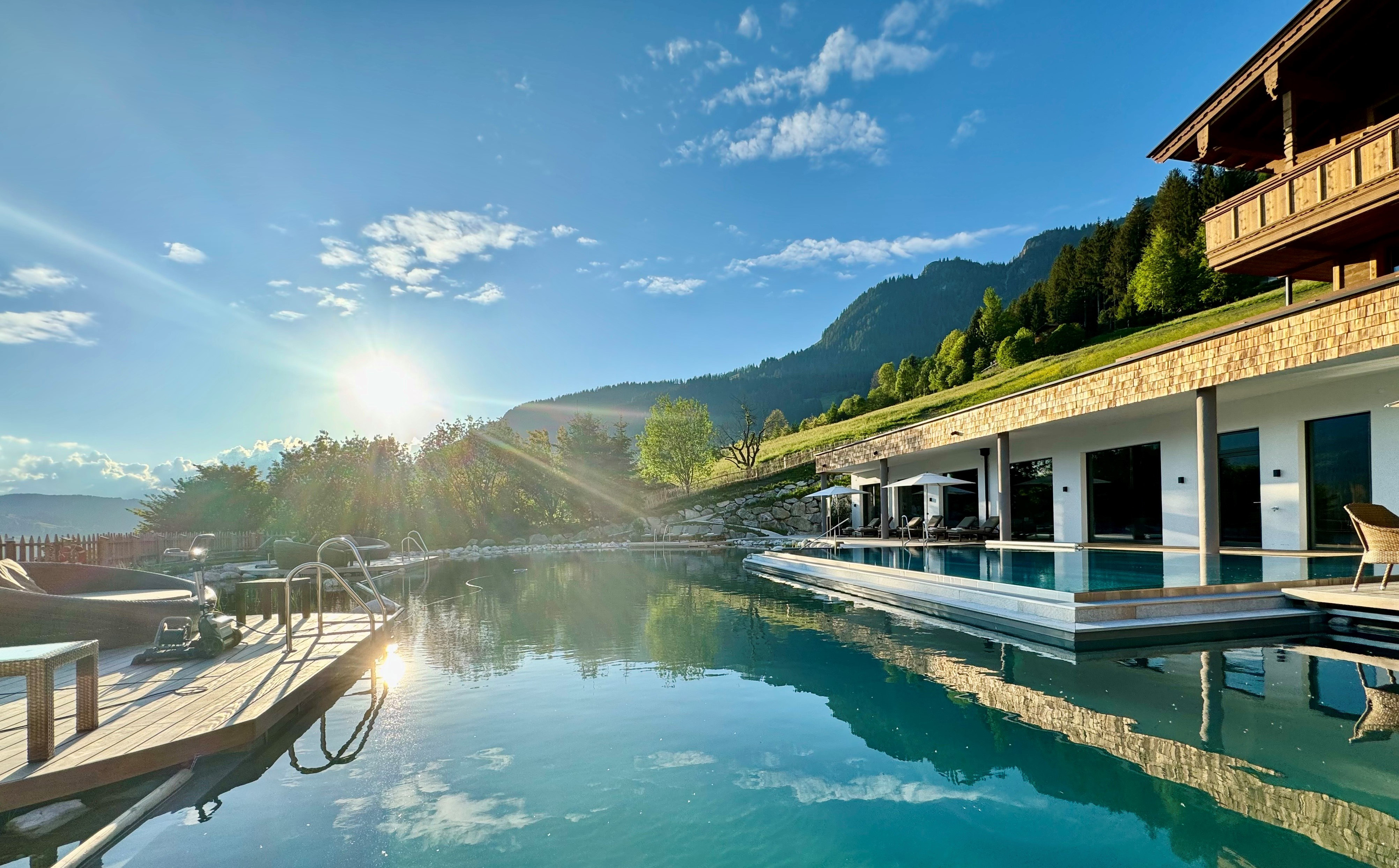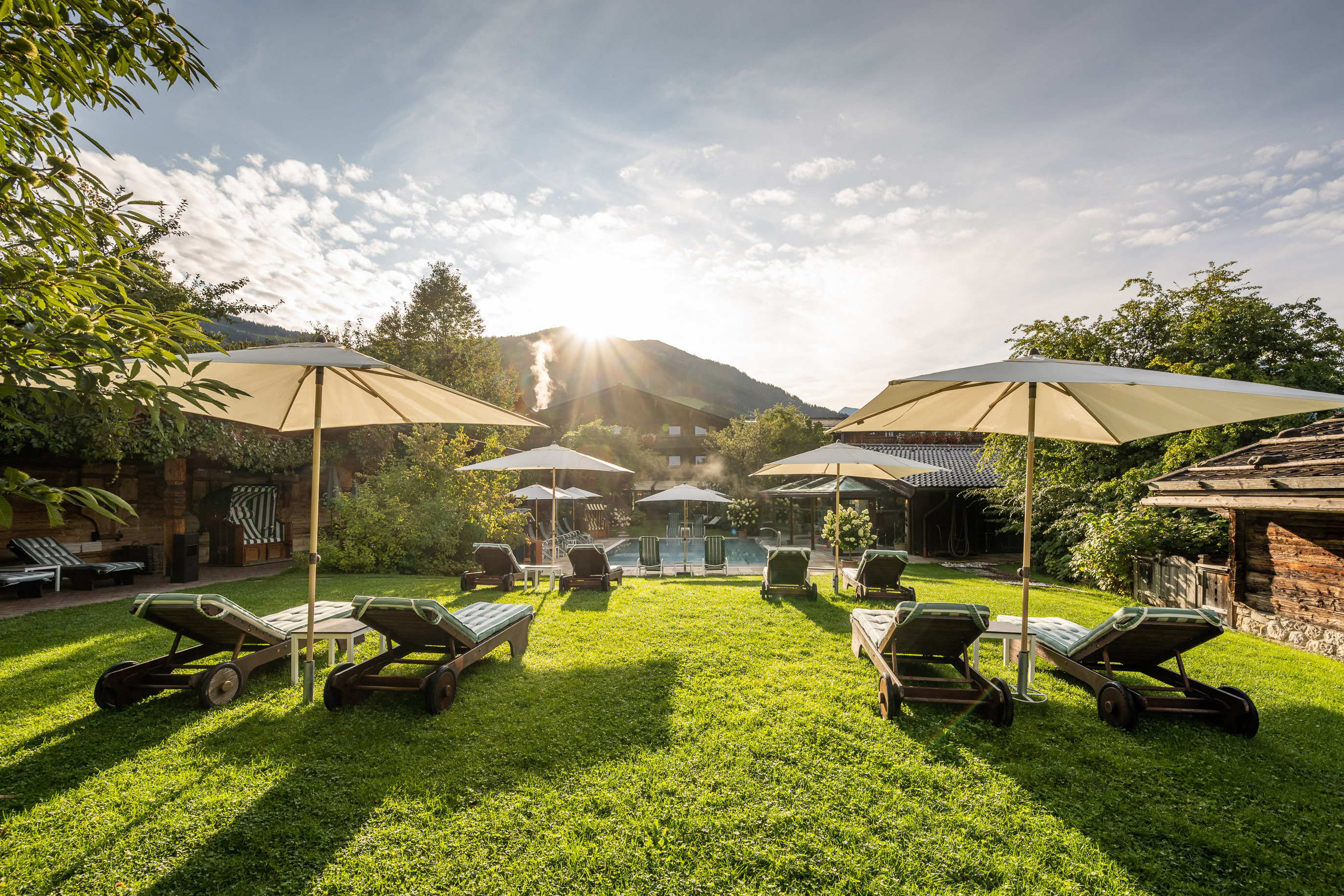 Natürliche Materialien, viel Tageslicht und Holz sowie edle Stoffe sorgen im neuen Adults-only „pure nature spa“ für eine angenehme Atmosphäre. Es gibt viel Freiraum für Gäste, der liebevoll angelegte Garten lockt in der warmen Jahreszeit ins Freie. Eines der Highlights ist ein großzügiger Naturpool mit ganzjährig beheiztem Outdoorpool und grandiosem Bergpanorama. Ebenso Adults-only sind Biosauna und Dampfbad, so auch die Eventsauna mit täglich zwei Aufgüssen und einem wunderbaren Ausblick auf Alpbach und den Galtenberg, nach denen es sich in der Kaltwassergrotte herrlich abkühlen lässt. Gespeist wird diese aus der hauseigenen Quelle, die direkt dem Gratlspitz entspringt.