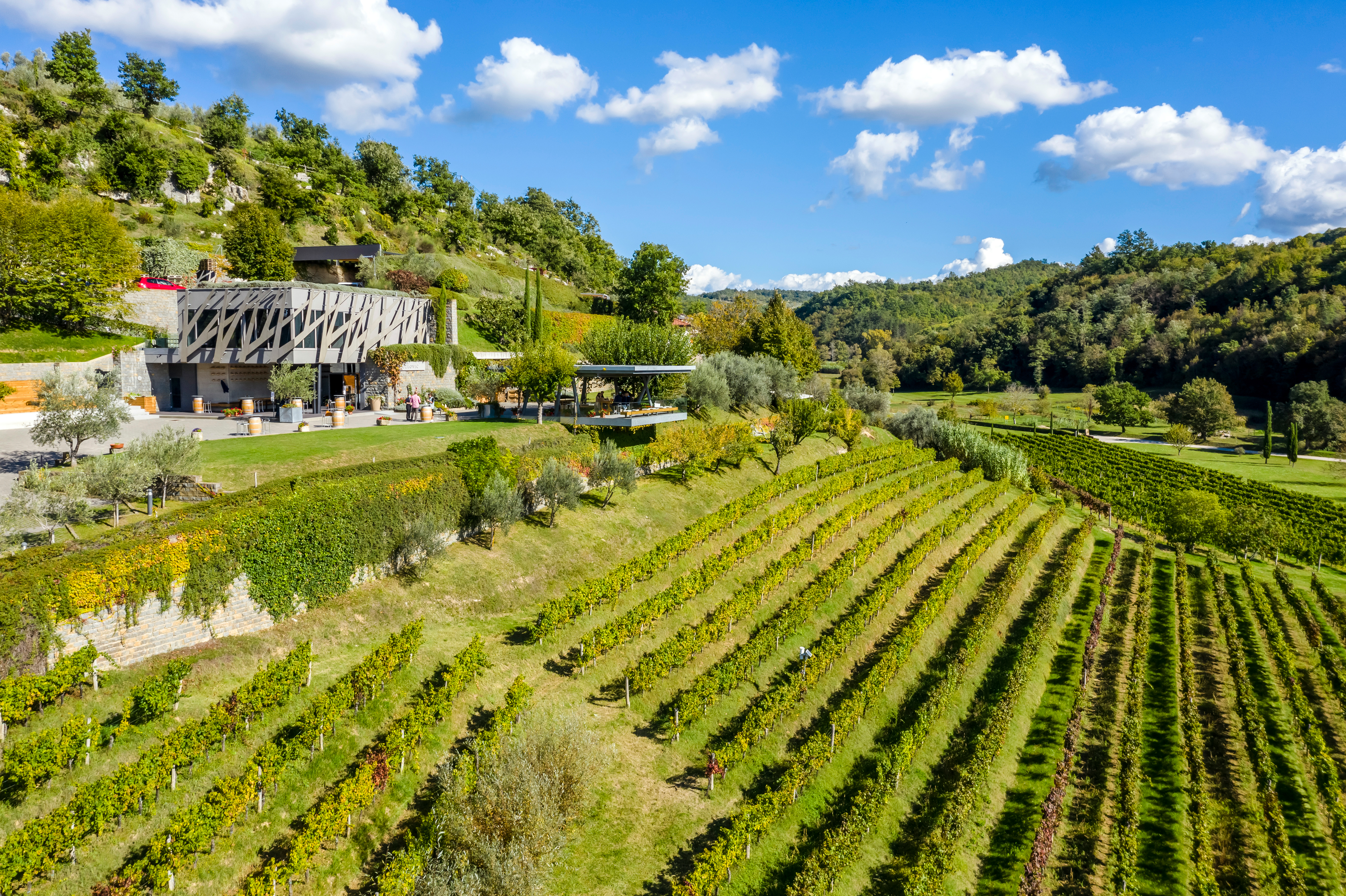 Ein Meilenstein in der Geschichte des Guts war 2012 der Neubau des Weinkellers – ein architektonisches Highlight, das in Zusammenarbeit mit dem namhaften kroatischen Architekten Željko Burić entstand. Der dreistöckige Bau mit 2200 m² Nutzfläche bietet eine perfekte Verbindung aus Funktionalität, Design und Landschaft – mit eleganter Degustationslounge, stilvoller Weinbar, Panoramaterrassen und freiem Blick über das Vale-Tal.