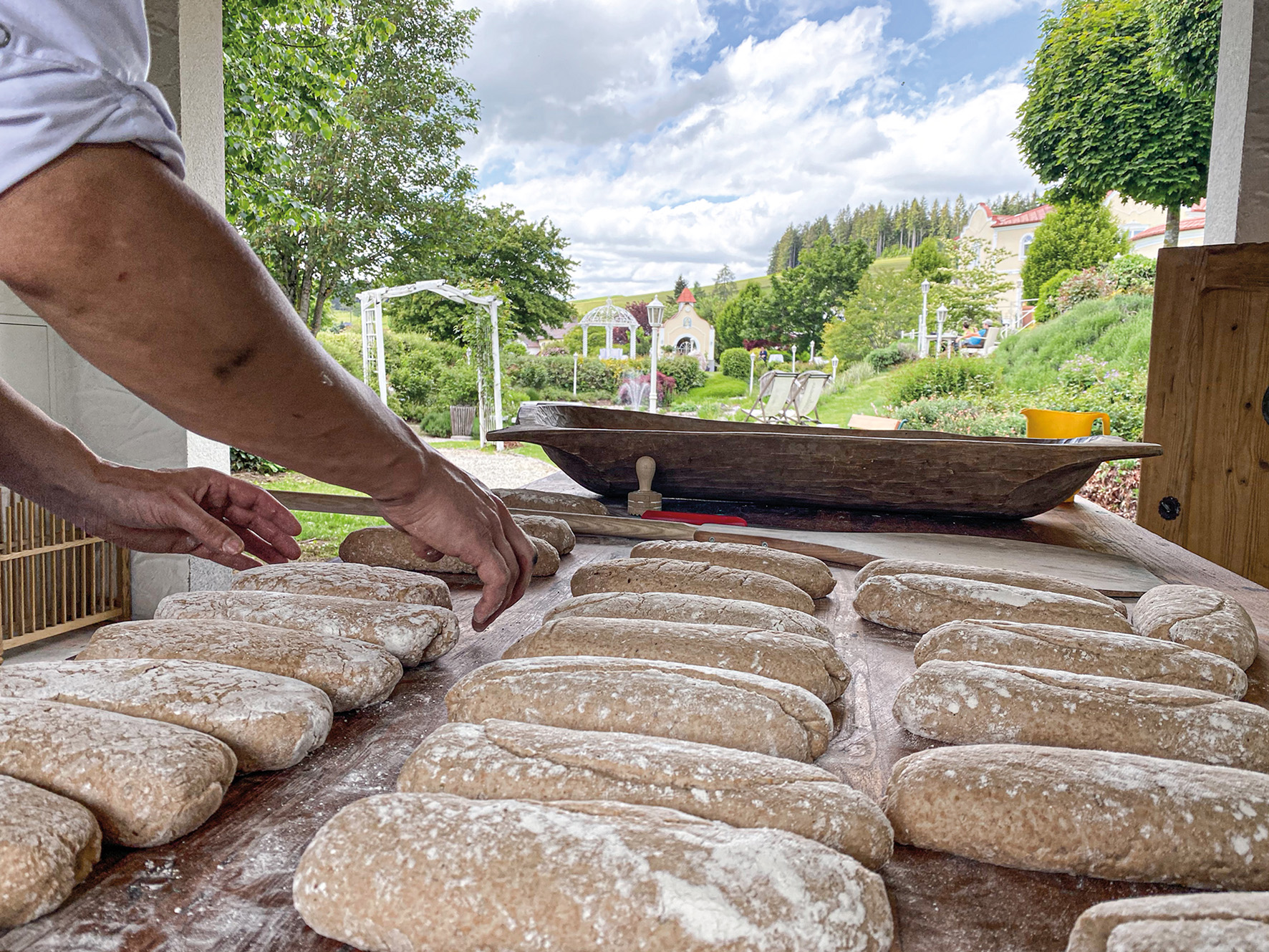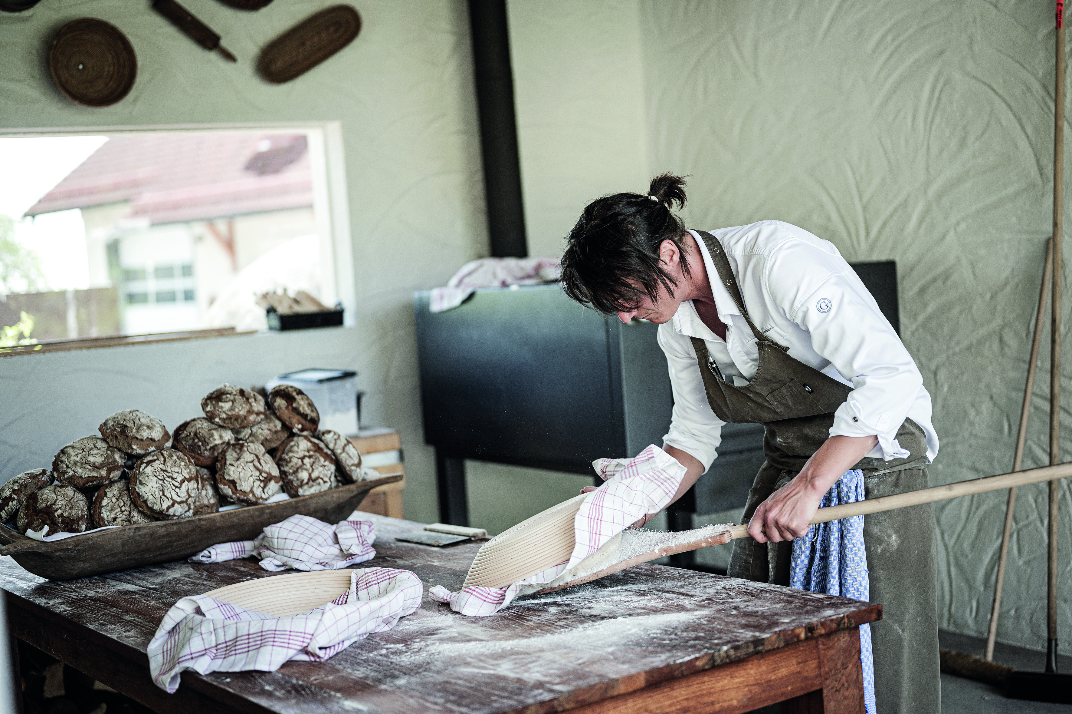 Es ist sieben Uhr früh in Afiesl, doch statt des Frühstücks gibt es bei Thomas Hofer ein Brühstück. Mit diesem rätselhaften Wort beginnt im „Bergergut“ die Einführung in die Welt des Brots. Es ist ein nachhaltiges Rezept, das hinter dem Erdäpfelbrot (wir sind schließlich im Kartoffel-Paradies Mühlviertel!) steht. „Brotreste wie Scherzerl oder Brösel werden vermahlen und überbrüht“, erklärt der Bäcker unter Österreichs Topköchen. Dann macht sich Thomas Hofer, im eigens errichteten Brotbackhaus, wieder an die Arbeit; die Zeit der Teigruhe ist genau berechnet. Sie richtet sich nach dem Taktgeber vor dem schönen Schwimmteich des „Bergerguts“: Drei Stunden braucht der Holzofen Hofers, um die ideale Backtemperatur von 300 Grad zu erreichen. „Du musst Außentemperatur und die Luftfeuchtigkeit jeden Tag beobachten – sie bestimmen die Holzmenge“.