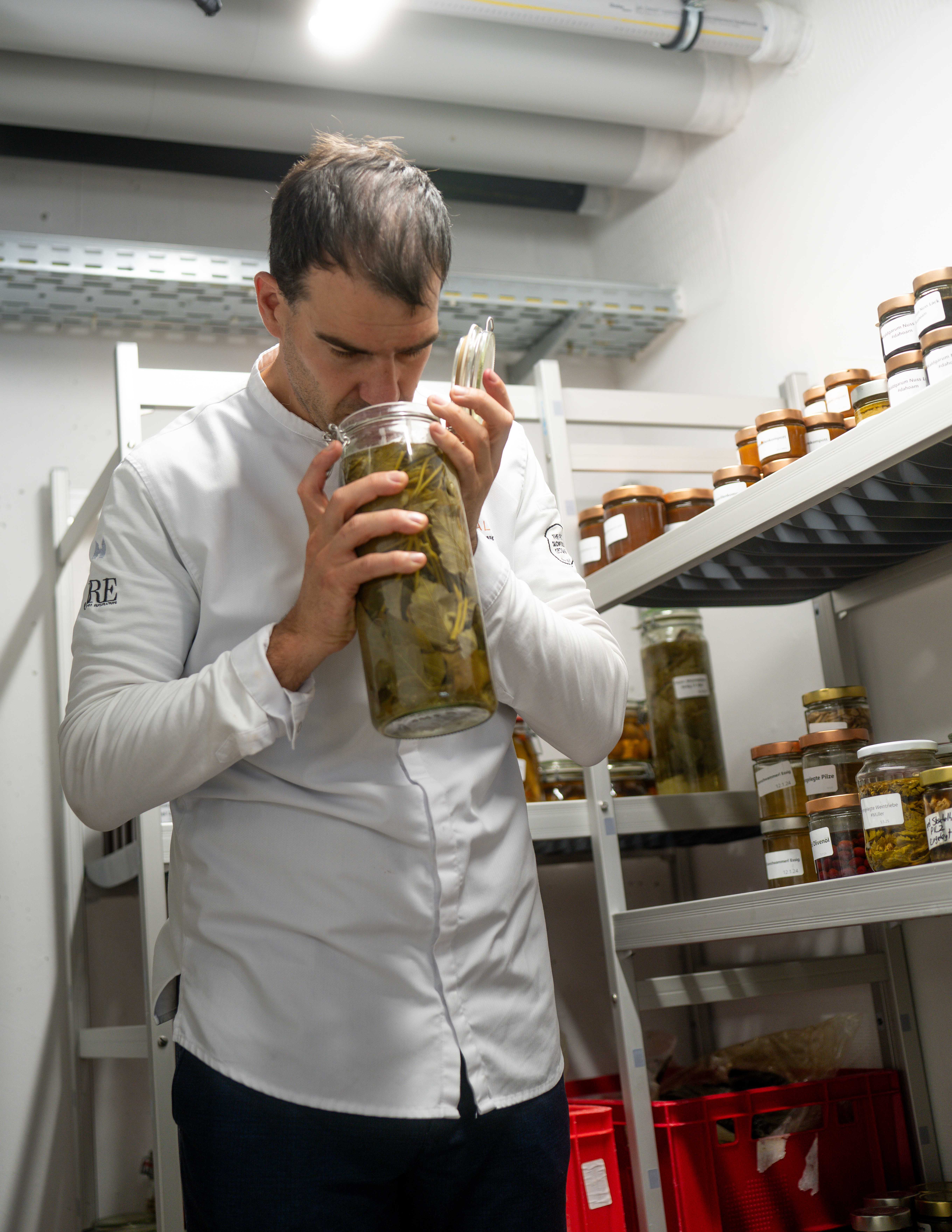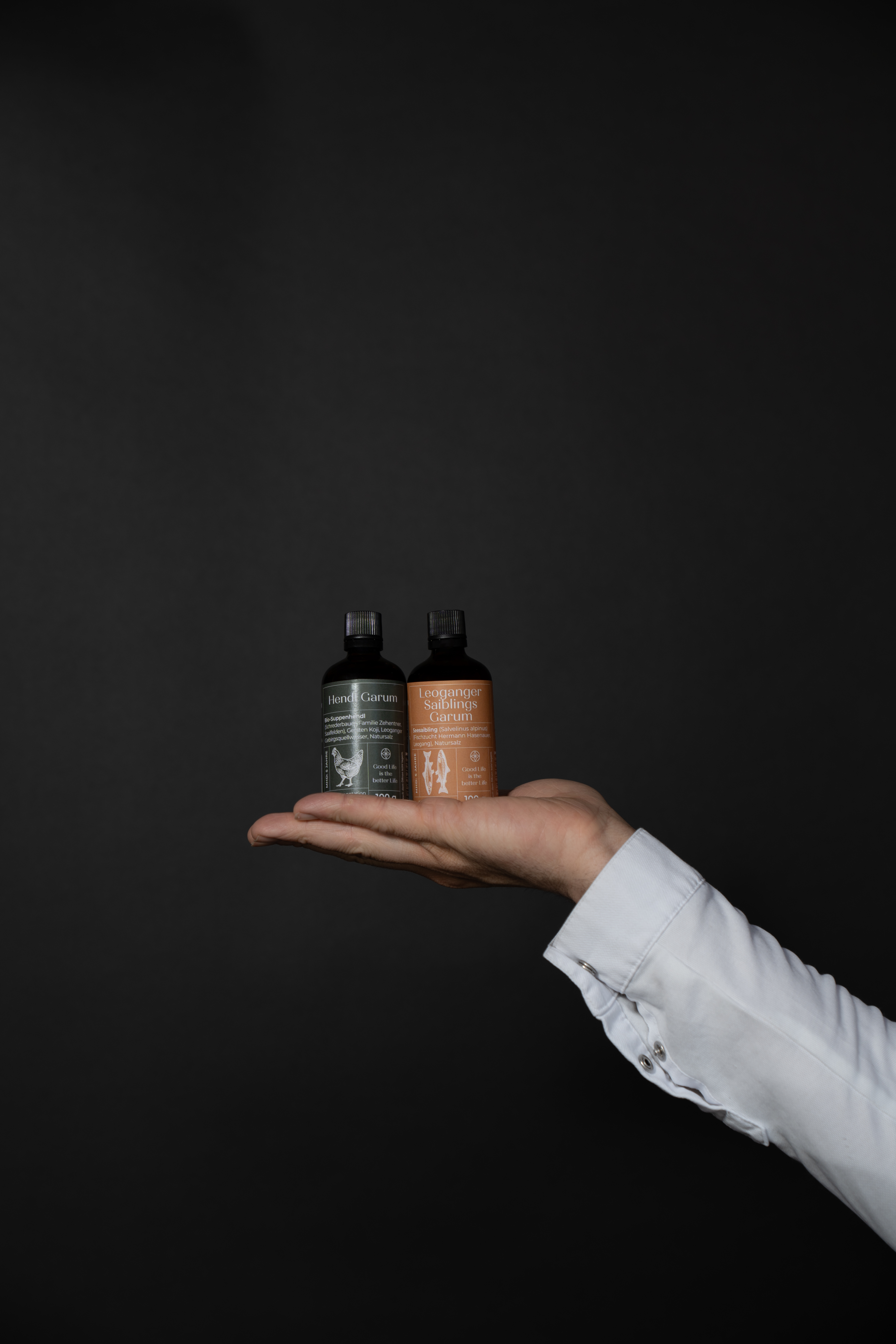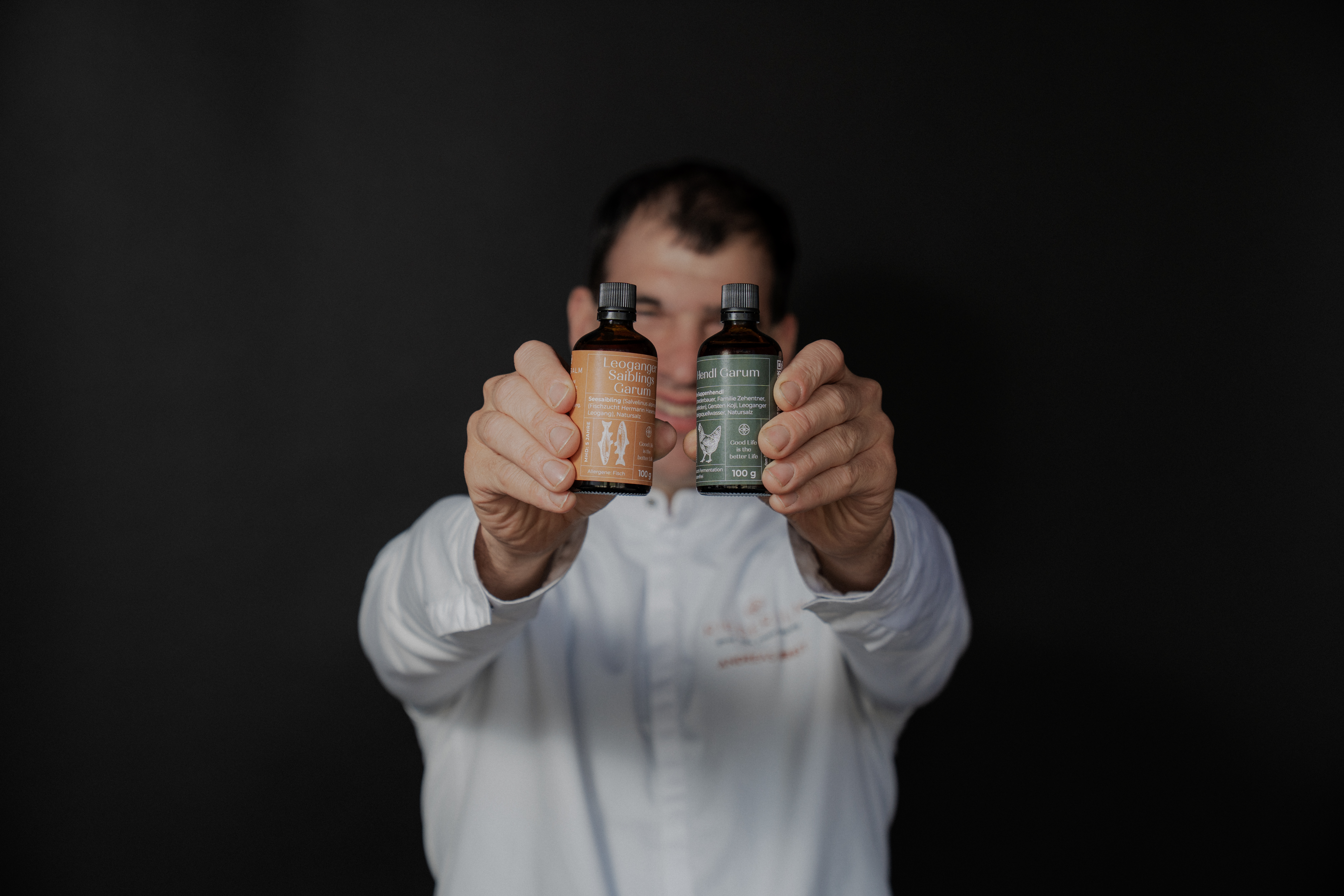Hühner, die aufgehört haben Eier zu legen, werden zumeist der Futtermittelindustrie zugeführt. Andreas Herbst will einen achtsameren Zugang finden und verarbeitet diese - neben klassischen Hühnerfond - in einem aufwendigen, vielschichtigen Fermentatiosprozess zu einem speziellen Hendl-Garum. Dazu lässt er die Hühner im Ganzen langsam im Ofen rösten, vermischt sie mit Gerste, die mit Koji (in diesem Fall Aspergillus Sojae) fermentiert wurde, sowie Leoganger Quellwasser und Natursalz und lässt das Ganze dann noch einmal 6-8 Monate bei 30 Grad Celsius fermentieren. Noch ein paar Handgriffe und das hochwertige Garum ist bereit, in den Gerichten von Andreas Herbst – neben einem Michelin-Stern findet sich auch ein Grüner Michelin-Stern und 4 Gault Millau-Hauben bei seinen Auszeichnungen – Anwendung zu finden.