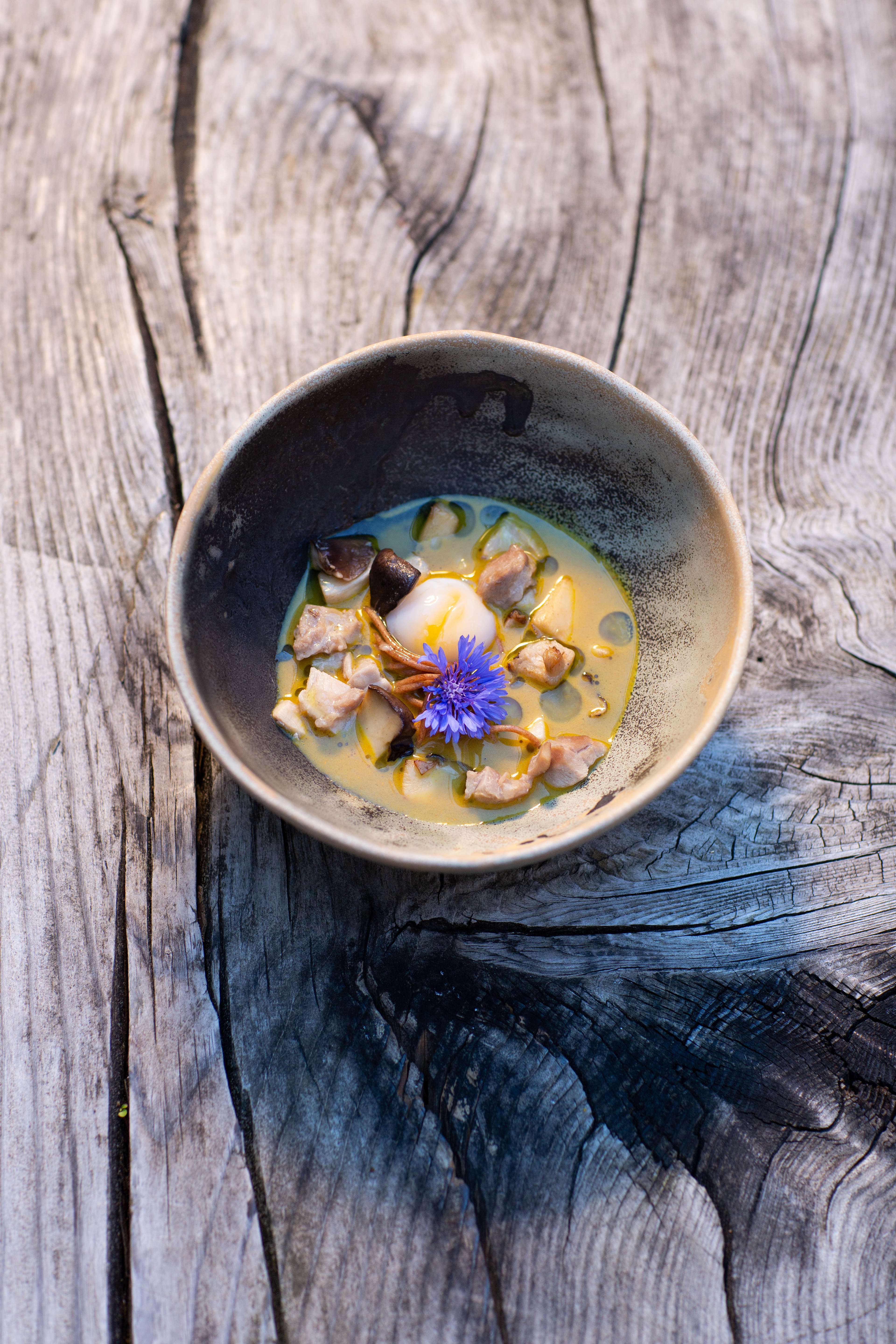 Im Tigre de Leche Dressing mit Stangensellerie vom Stechaubauer kommt das Hendl-Garum ebenso zum Einsatz wie in der Marinade der Wildmasthendlkeule und in damit veredelten Saucen. Auch Gerichten wie dem Stechaubauer-Ratatouille, Eierschwammerlgulasch, Hühnersuppe, Bouillonkartoffeln und der alpinen Ramen-Suppe verleiht es eine ganz besondere Note. Durch ein spezielles Fermentationsverfahren stellt Andreas Herbst sicher, dass auch jene Gäste mit Gluten-Unverträglichkeit bedenkenlos zugreifen können.
