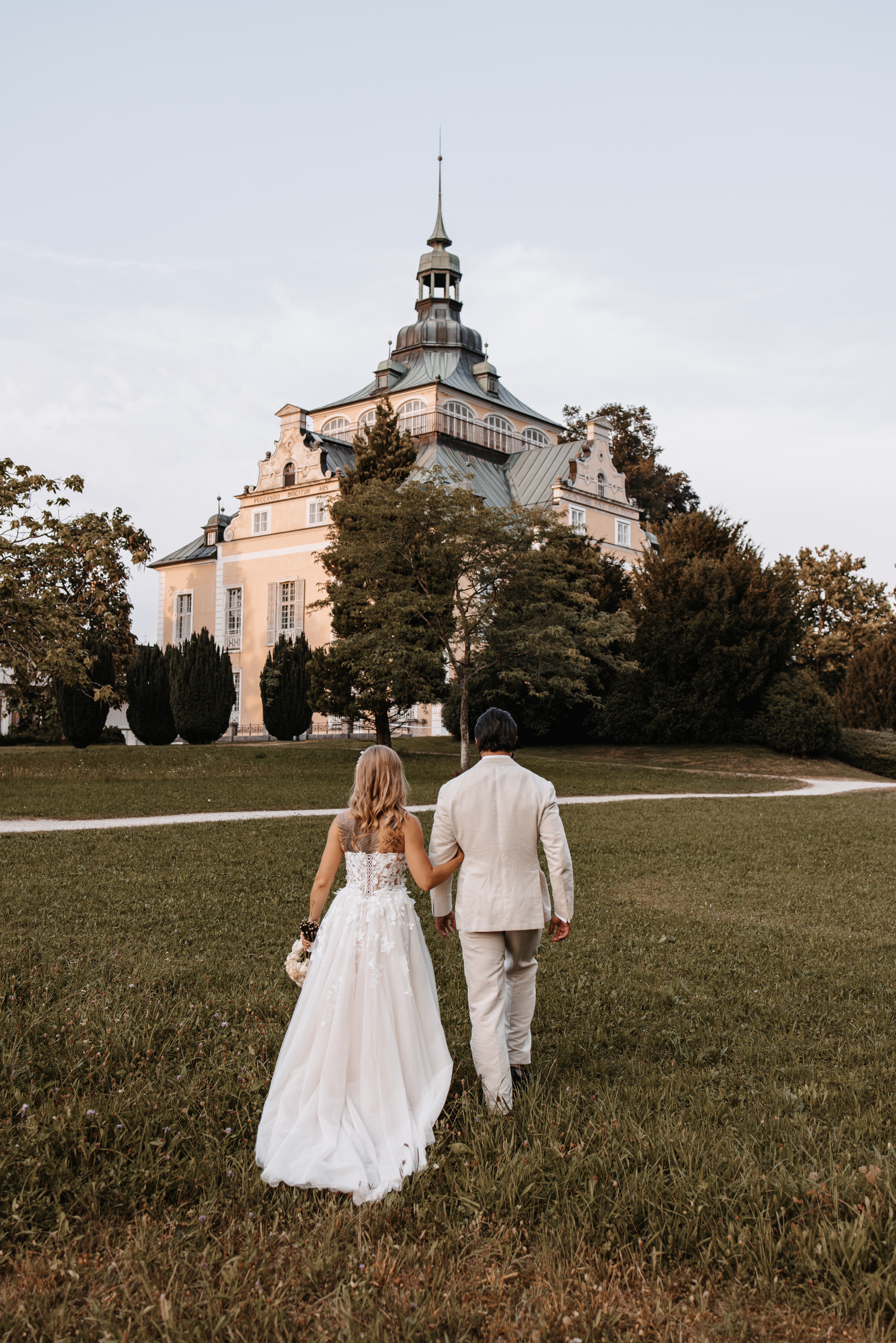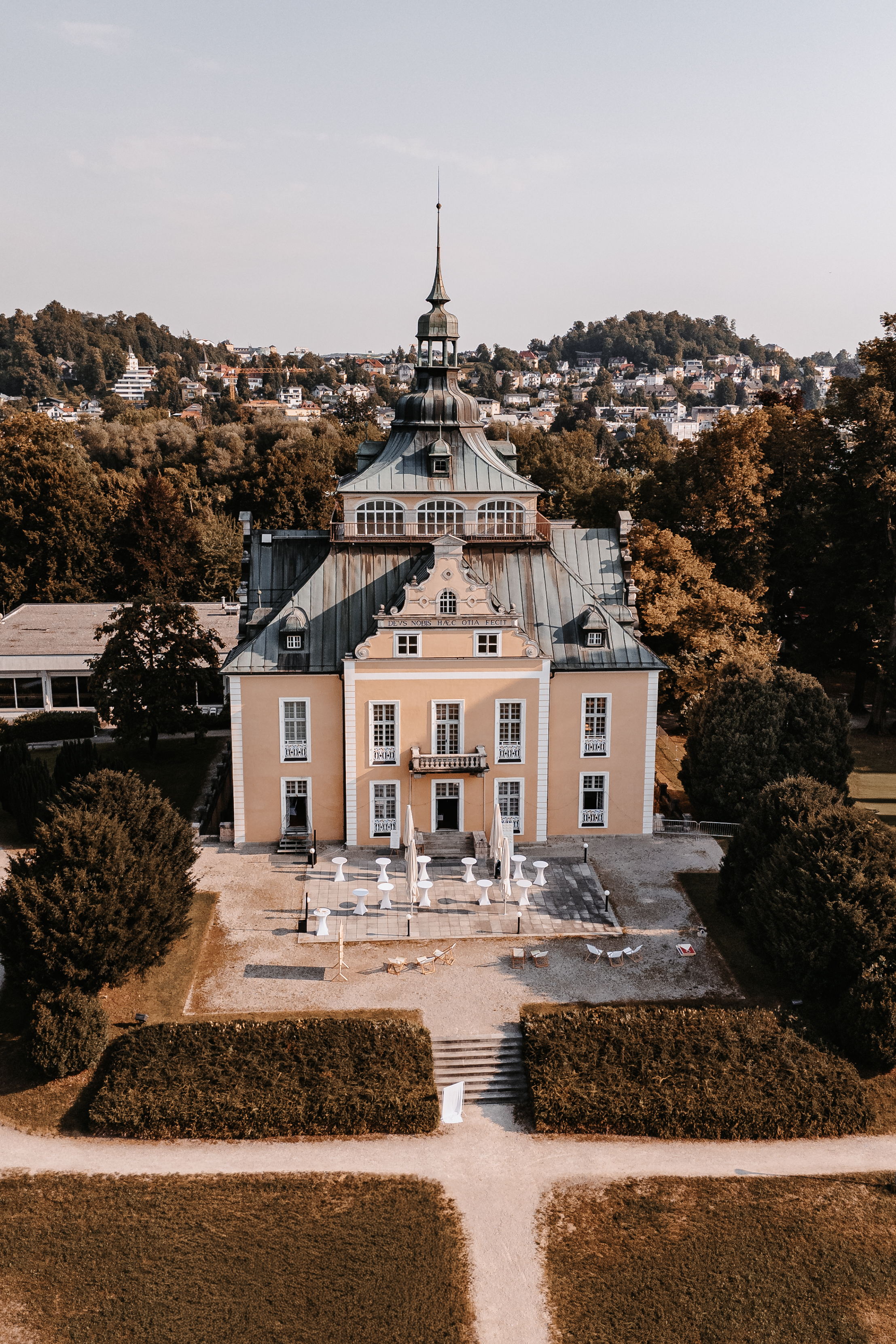 Für 50 bis 250 Gäste bietet die Villa einen besonderen, festlichen Rahmen. Mehrere Räume, darunter der Prunkraum mit seiner beeindruckenden Kassettendecke, die ehemalige Bibliothek mit Original-Leihgaben aus dem OÖ-Landesmuseum oder die Räumlichkeiten des früheren Kaffeehauses stehen für den Hochzeitstag bereit. Über eine Treppe gelangt man auf die Terrasse und genießt einen überwältigenden Ausblick nicht nur auf den Park, sondern auch auf den Traunsee, Grünberg und Traunstein.