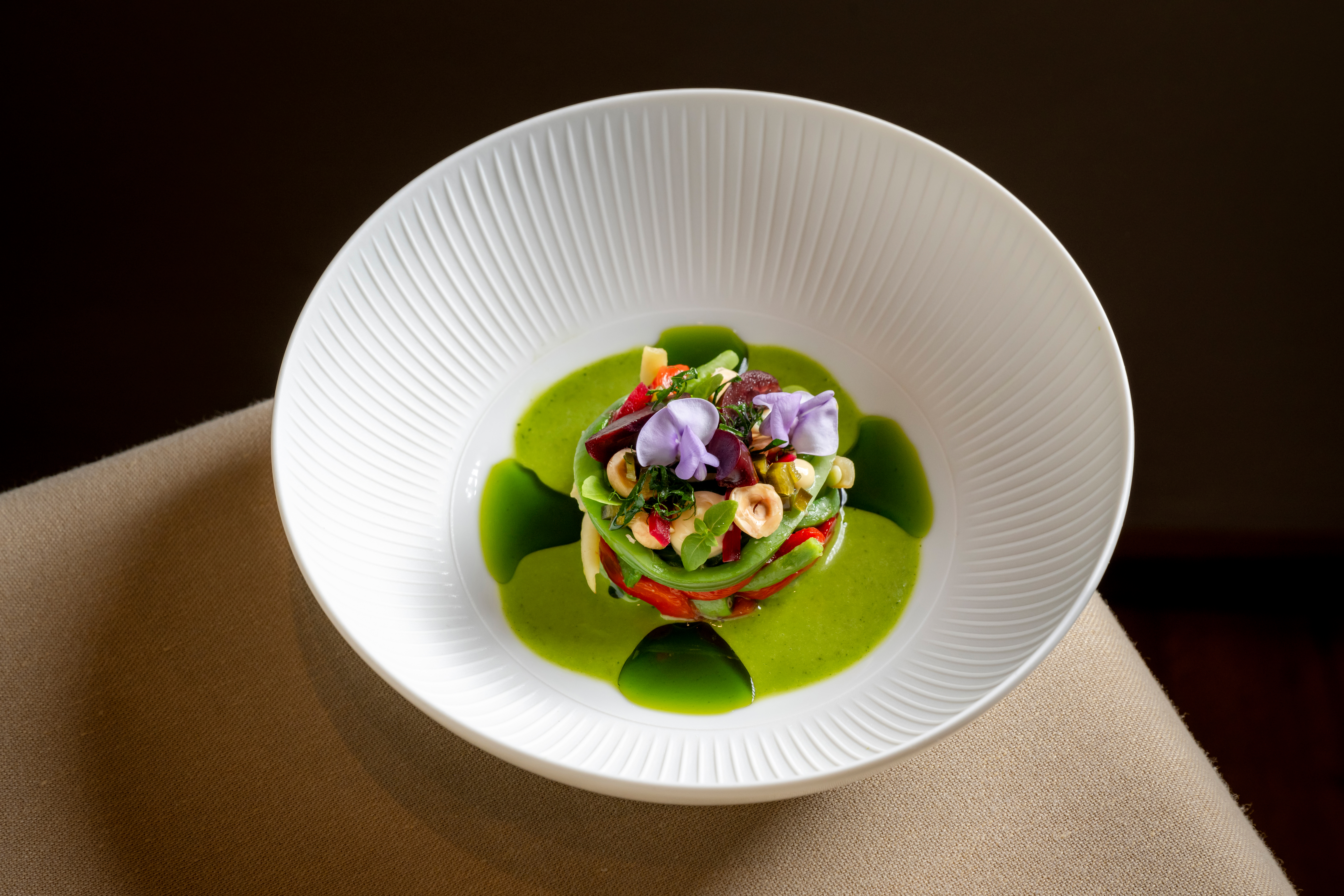 in Nussbutter confierte Artischocken, Kartoffel-Spitzkrautmousseline, Guanciale & Kernöl & Kaviar-Beurre Blanc