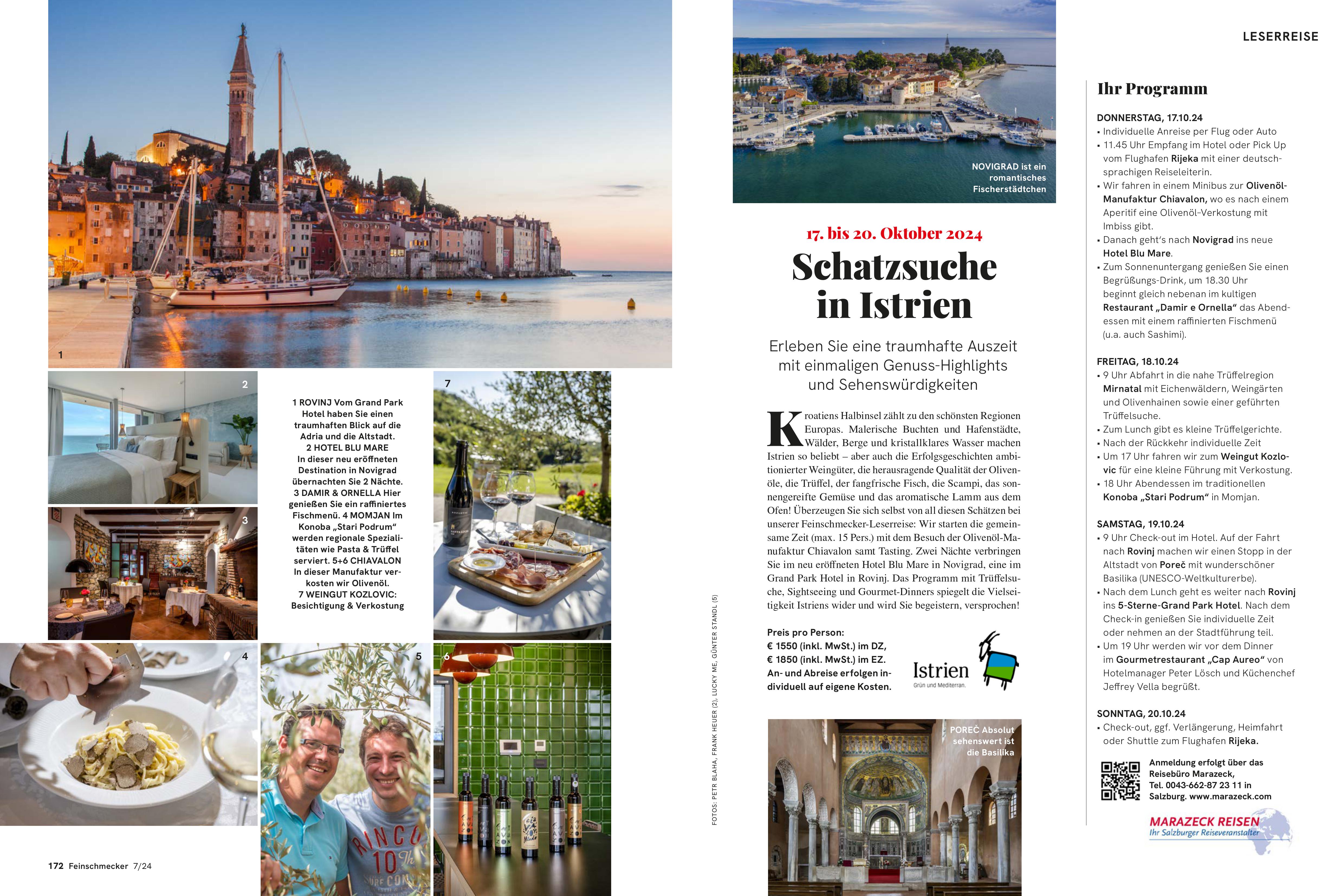 Erstmals organisiert das Gourmetmagazin DER FEINSCHMECKER eine exklusive Kulinarikreise nach Istrien. Mit ganz besonderen Insider-Highlights und nur einem Problem – es können leider lediglich maximal 16 Genießer:innen teilnehmen.