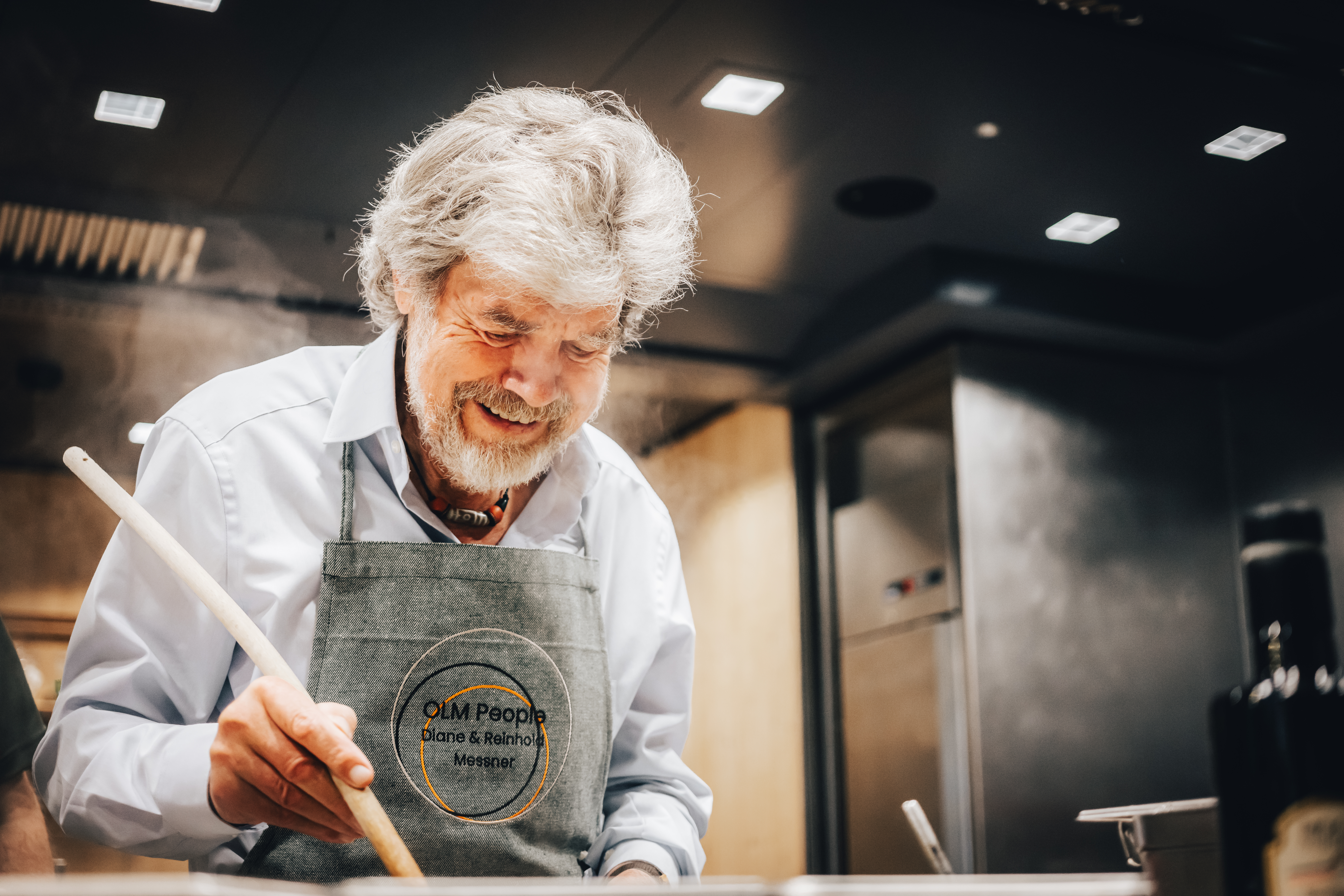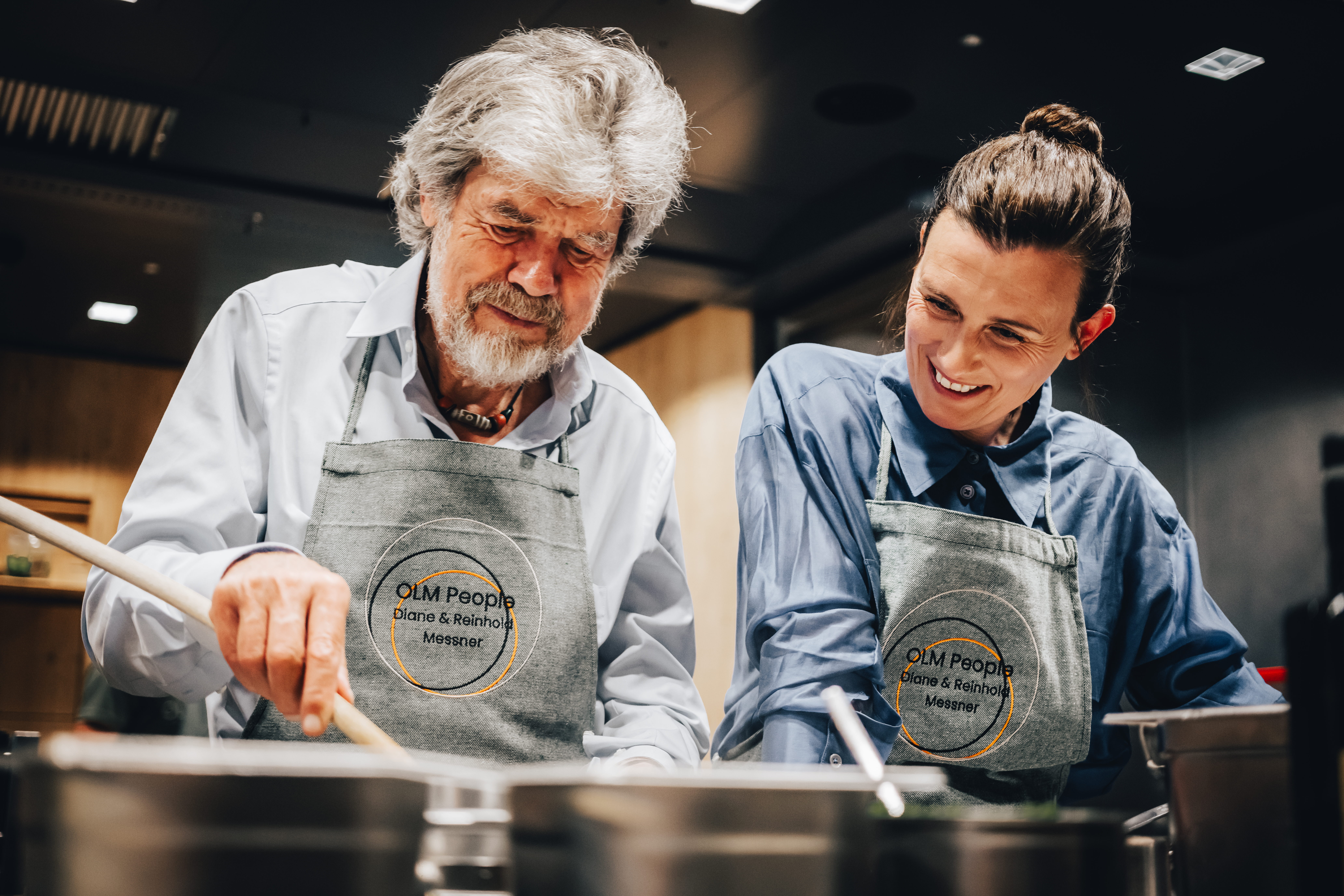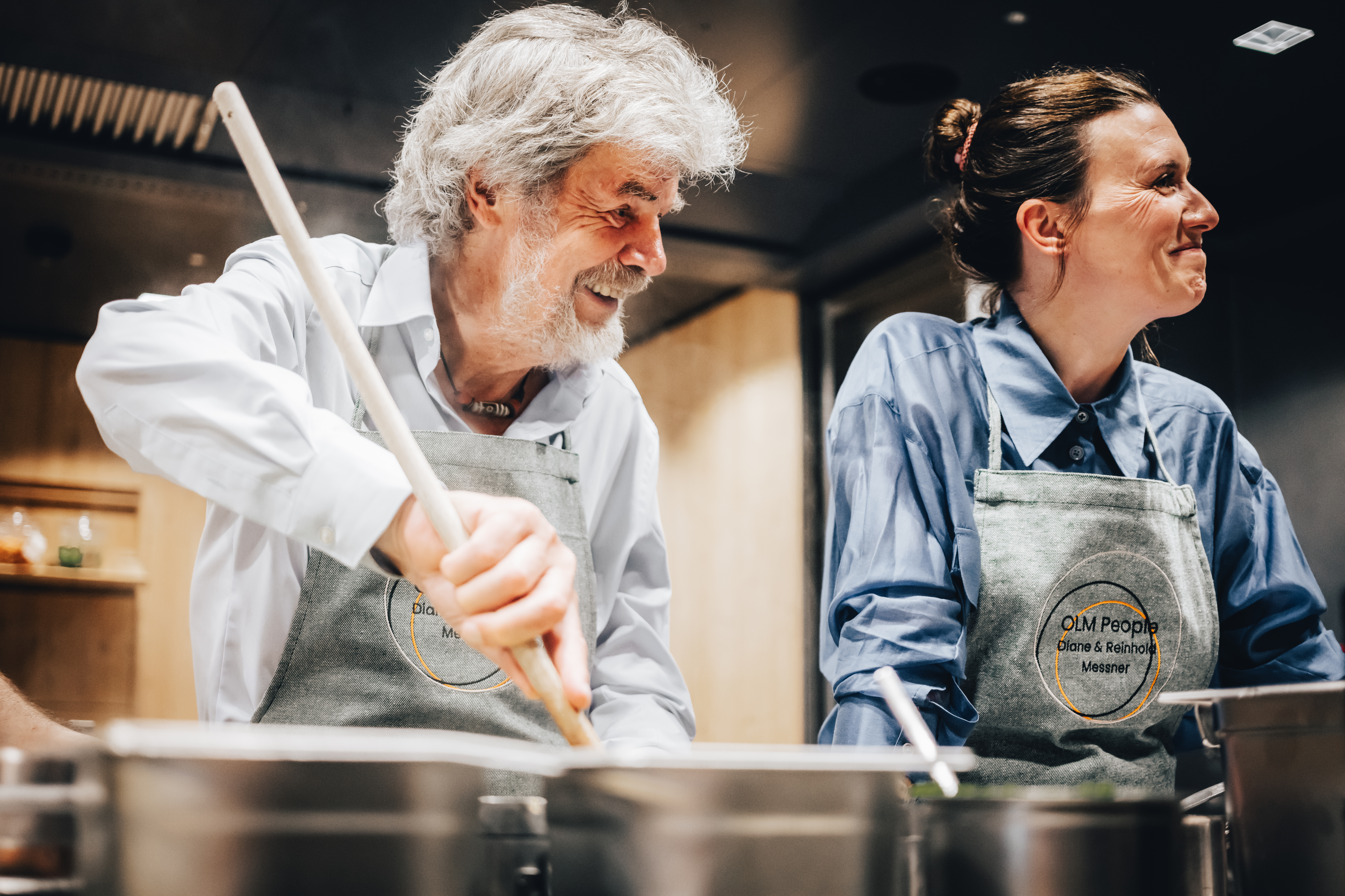 Am Abend wird im PRENN°, dem Restaurant des OLM Nature Escape ein regional inspiriertes Menü serviert, bei dem Diane und Reinhold Messner auch selbst Hand anlegen. Ein umwerfendes Orzotto wurde gerührt, eine Art Risotto, bei dem der Reis durch Perlgraupen ersetzt wird.