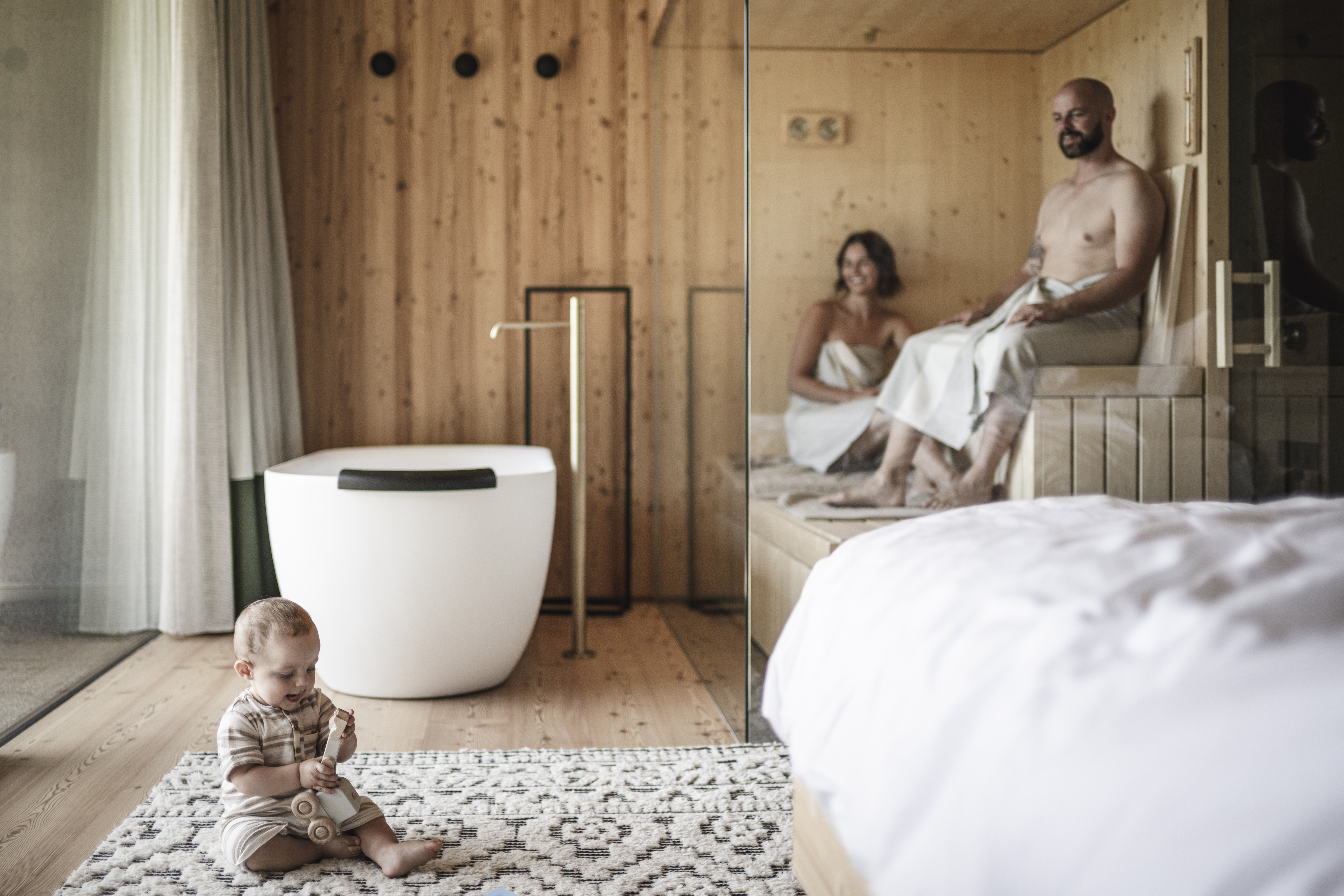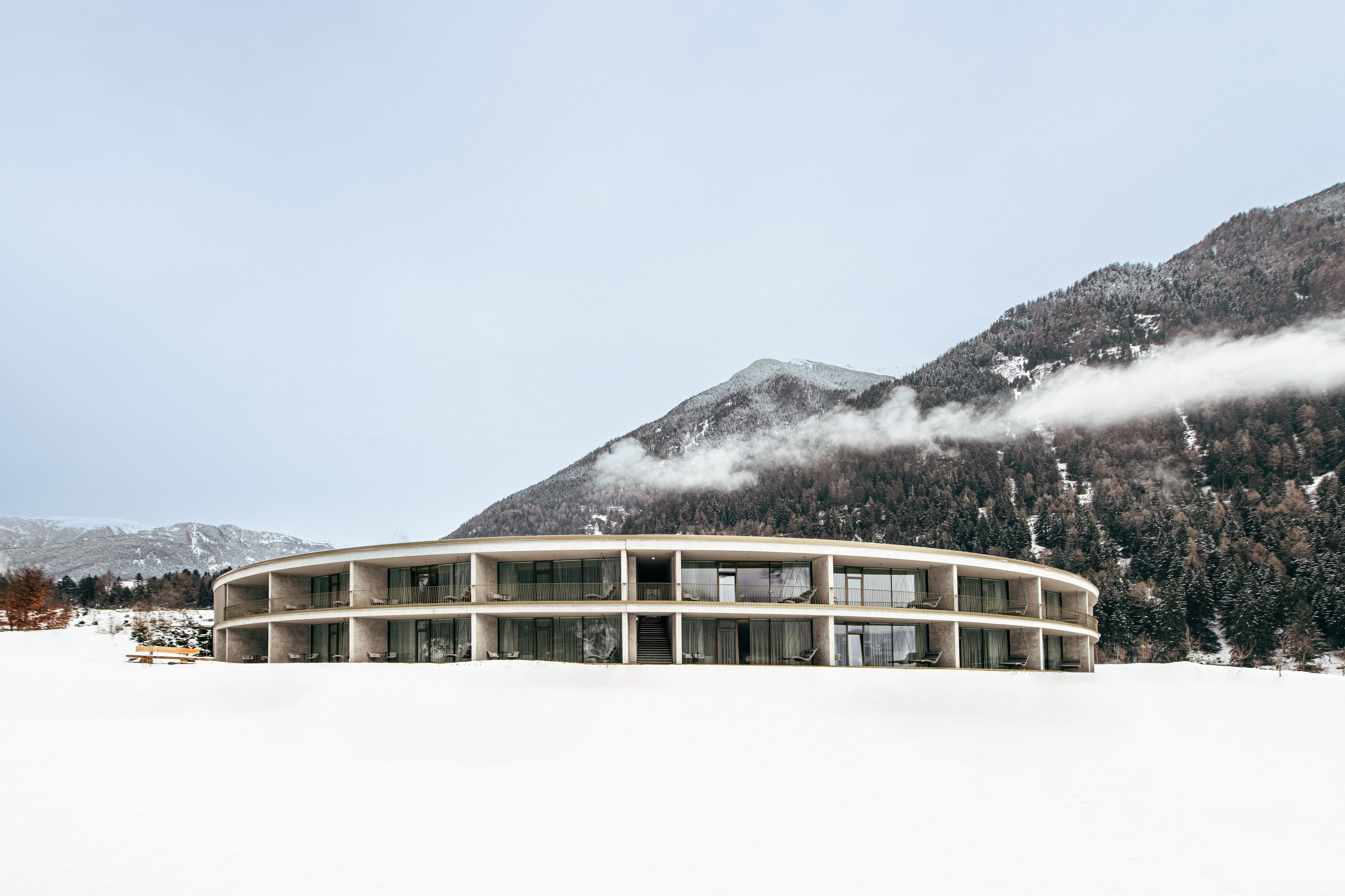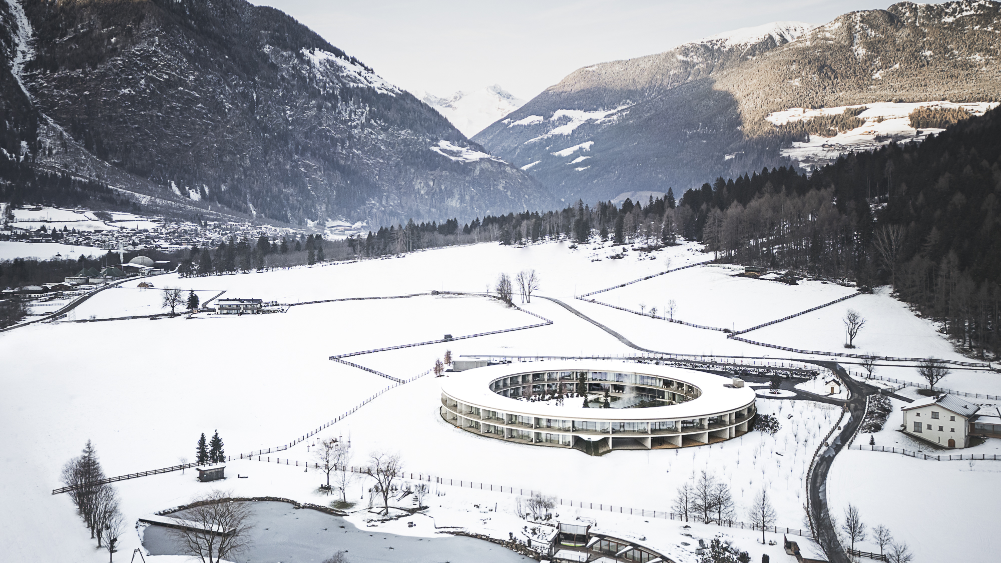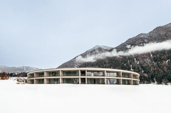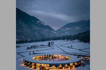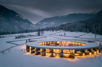 Lärchenholz umhüllt die Fassade, bodentiefe Glasfronten öffnen den Blick auf die Dolomiten. Im OLM verschwimmen die Grenzen zwischen Innen und Außen, zwischen Design und Landschaft. Nachhaltigkeit ist hier gelebte Praxis: Photovoltaik, Wasserkraft und Erdwärme versorgen das CO₂-neutrale Haus. Zu den Wellness-Eckdaten gehören ein Naturbadeteich im Innenkreis, In- und Outdoorpool sowie ein Saunabereich – immer begleitet vom Panorama des Tauferer Ahrntals.