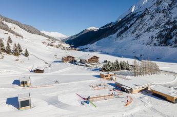 Zurück im Tal lockt die Playarena Tux: 1.200 Quadratmeter Indoor-Spaß mit Hochseilgarten, Kletterwand, Trampolinpark und Riesenrutschen. Für Hotelgäste kostenlos. Hintertux ist Österreichs einziges Ganzjahres-Gletscherskigebiet – 100 Prozent Schneegarantie, auch im Hochsommer. Direkt neben dem Hotel liegt das Kinderland, wo die Kleinsten Skifahren lernen. Dazu 14 Kilometer Langlaufloipe durchs Tuxer Tal, zwei Rodelbahnen zur Höllensteinhütte und Bichlalm, Eisstockschießen und der Eislaufplatz in Tux.