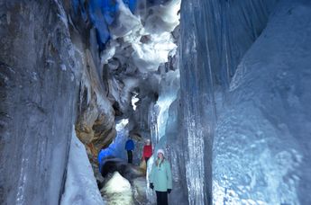 Drei Gondeln, 45 Minuten Auffahrt, dann steht man auf 3.250 Metern. Der Eingang zum Natureispalast ist ein unscheinbarer Spalt im Eis. Dahinter ein unterirdisches Labyrinth aus blau schimmerndem Gletschereis, etwa 30 Meter unter der Skipiste. Gefrorene Wasserfälle, meterlange Eisstalaktiten und Eiskristalle, die im Licht funkeln. Heute führen Gänge durch die Eiswelt, vorbei an kunstvoll geformten Skulpturen, bis man vor einem unterirdischen See steht. Boot fahren. Im Gletscher. Bei null Grad. Eine Erfahrung, die es so nirgendwo sonst in Europa gibt. Für Familien aus dem Hintertuxerhof ein Tagesausflug: Die Gondel ist zu Fuß erreichbar, die Talabfahrt endet direkt am Hotel.