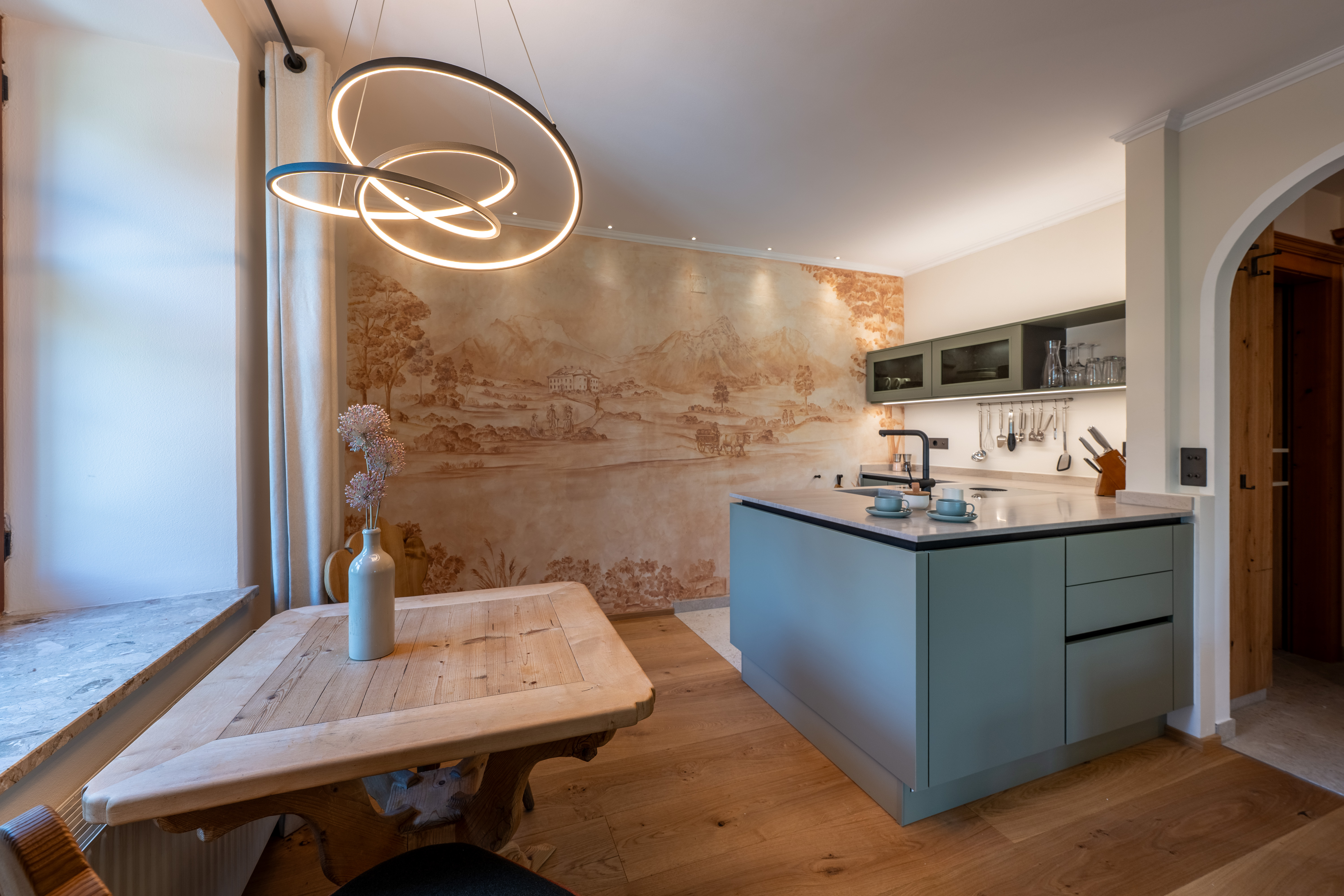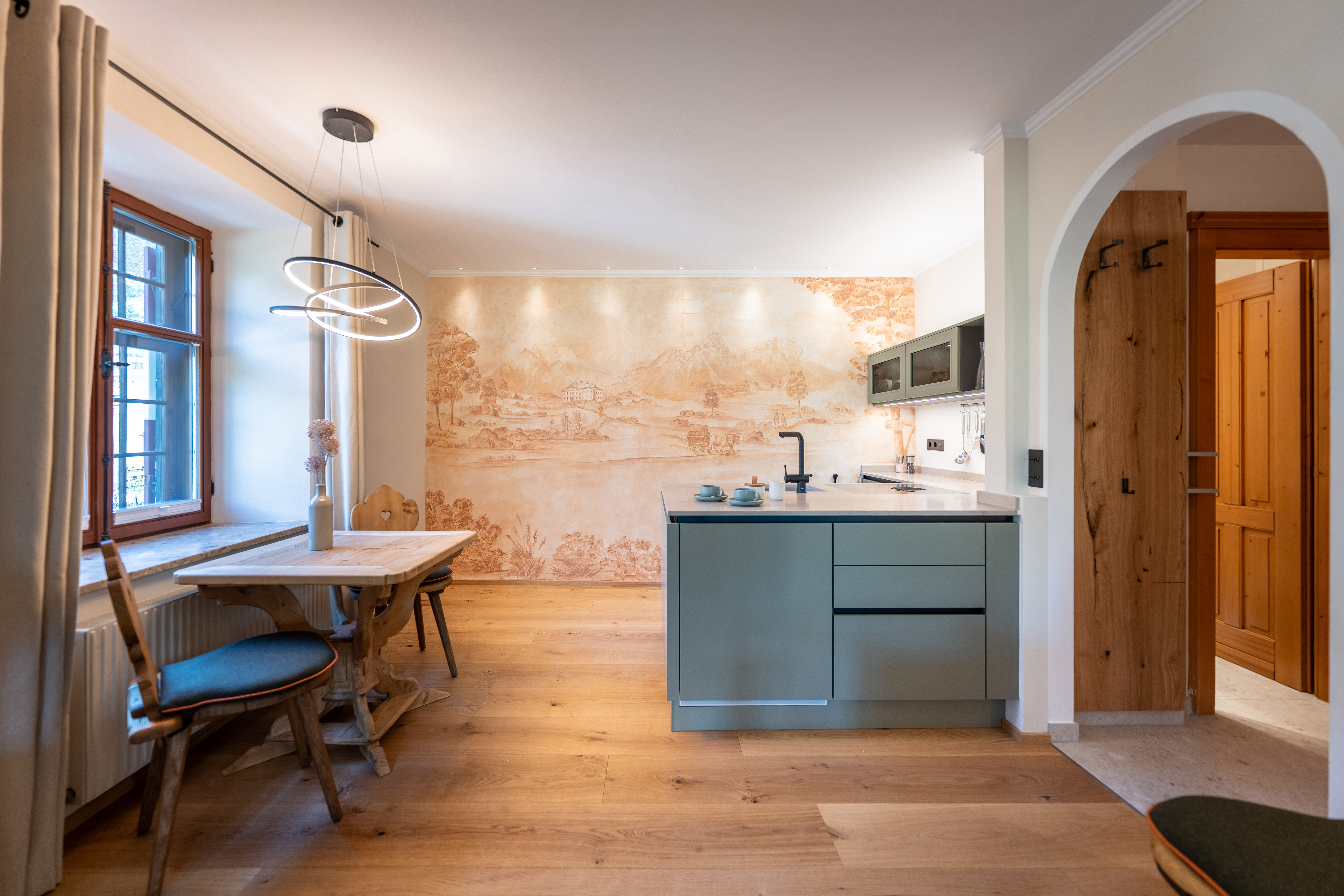 Mit einem sicheren Gespür für Stil hat Familie Kössler zwei Suiten ihres 300 Jahre alten Ansitzes renoviert und mit modernem Flair runderneuert: Edle Materialien, klare Linien und handverlesene Details, gepaart mit dem Charme des historischen Gemäuers sorgen für ein behagliches Wohnambiente. Auf jeweils großzügigen 48 m2 gibt es eine bestens ausgestattete Designküche mit Essbereich und einen Schlafbereich für zwei bis drei Personen mit freistehender Badewanne, die den Blick direkt aufs Zugspitzmassiv freigibt.