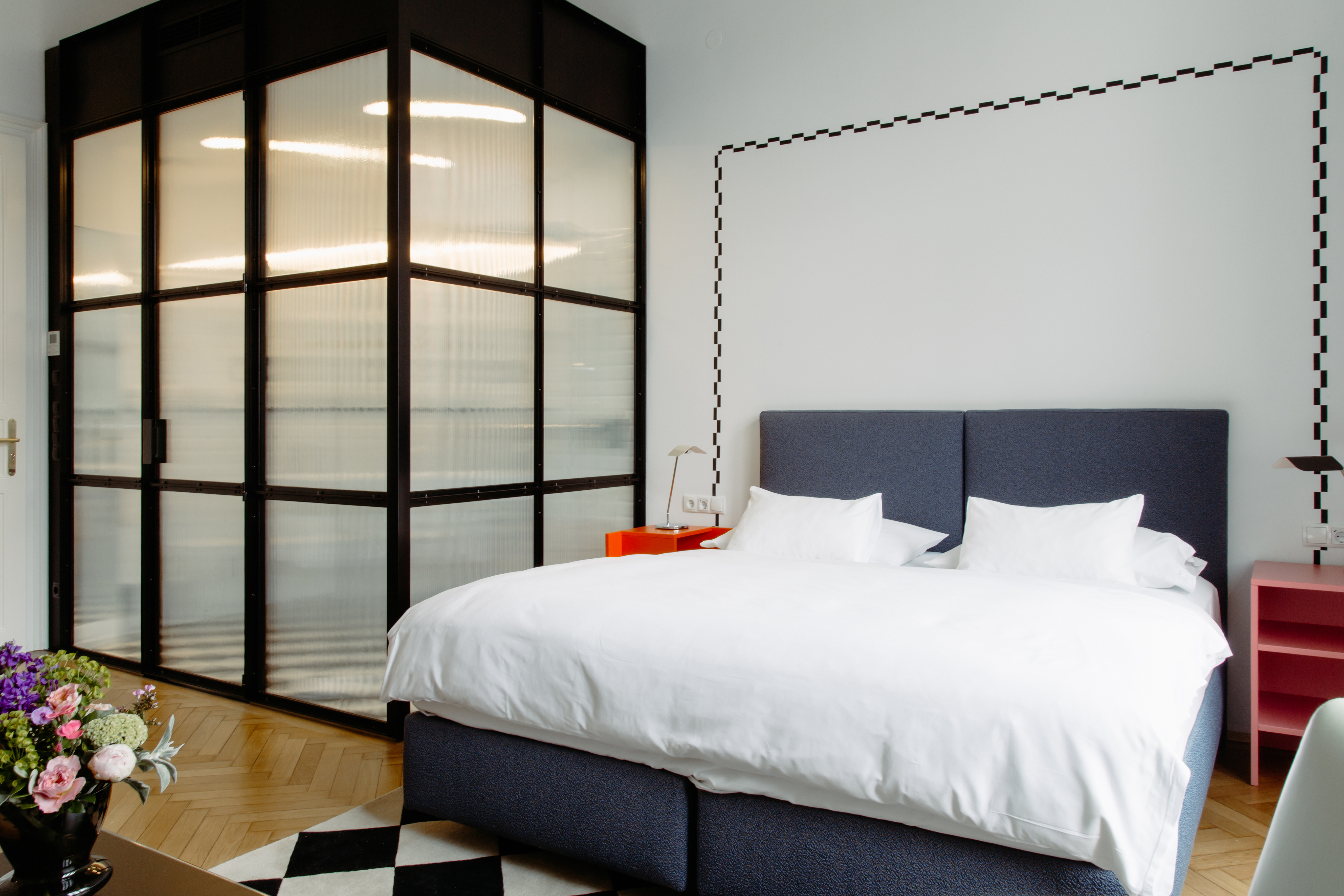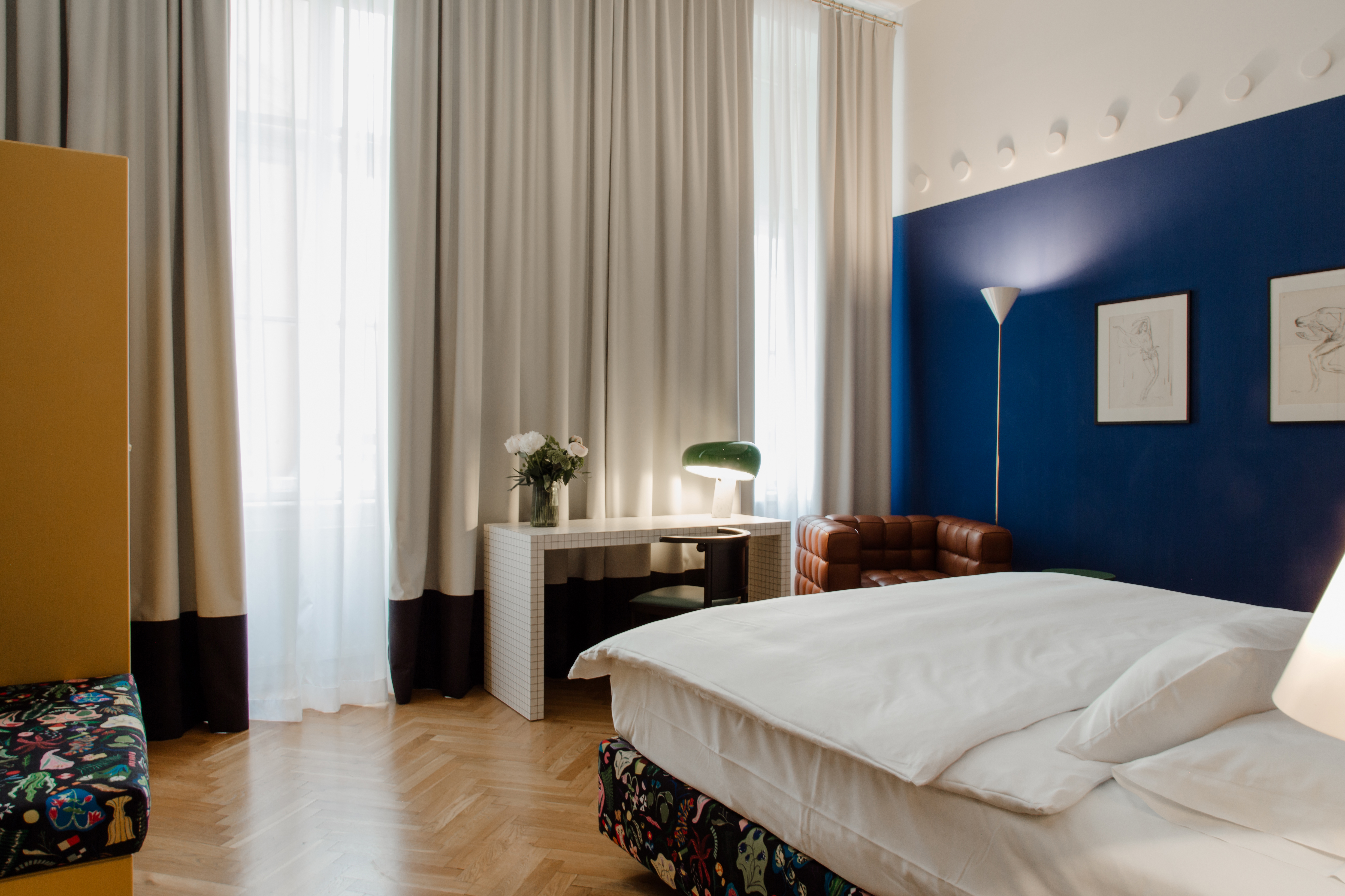 In Zimmer 14 stehen sattes Safrangelb und intensives Blau im Vordergrund, die Arbesser mit dem Wiener Jugendstil assoziiert, sowie der farbenfrohe Stoff „Flowers“, den er in Anlehnung an den Architekten Josef Frank für Wittmann entwarf. Das Spiel mit Geometrie, Schachbrettmustern und Würfelformen war Arthur Arbessers gestalterische Idee für Zimmer 30.