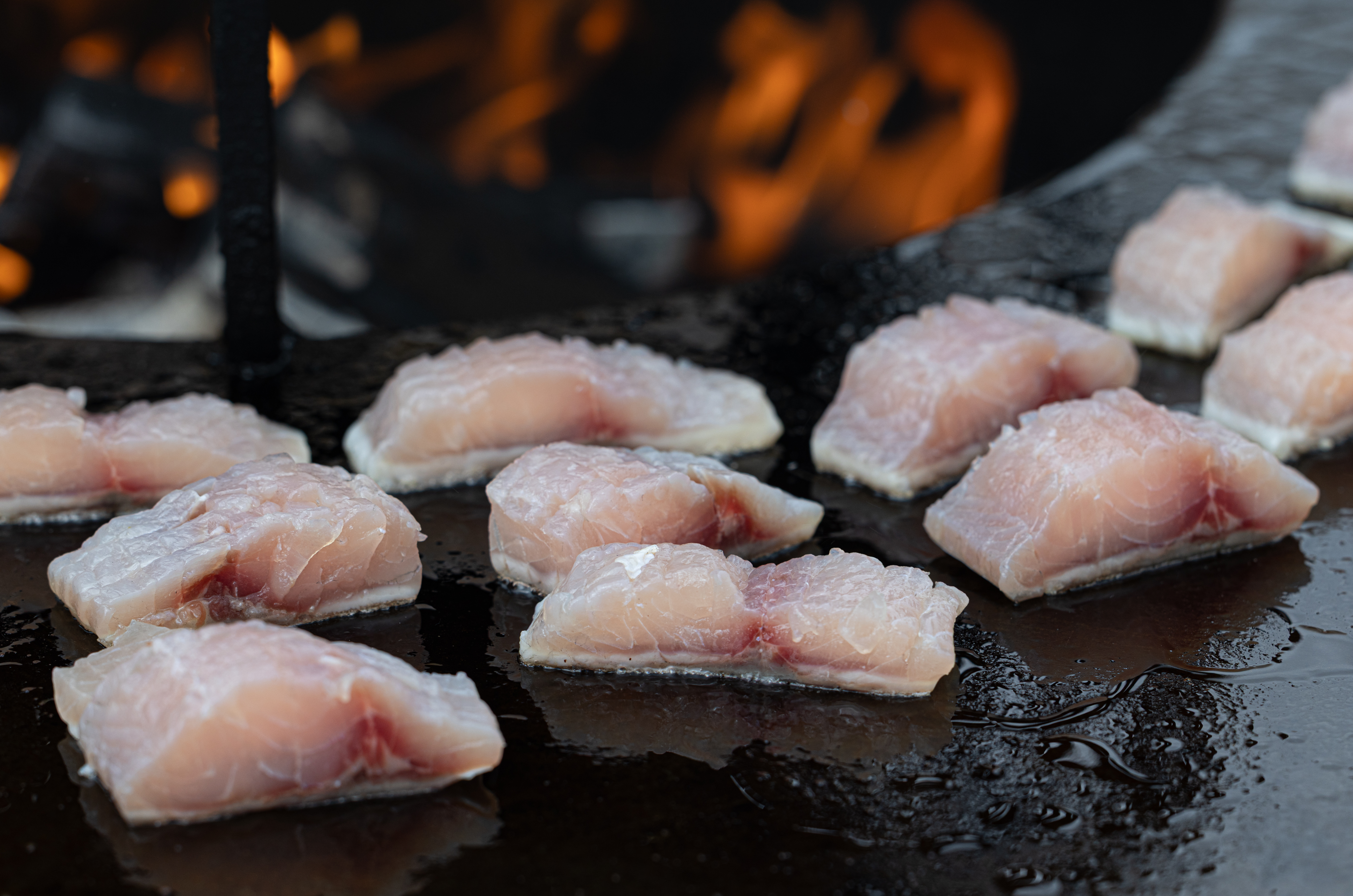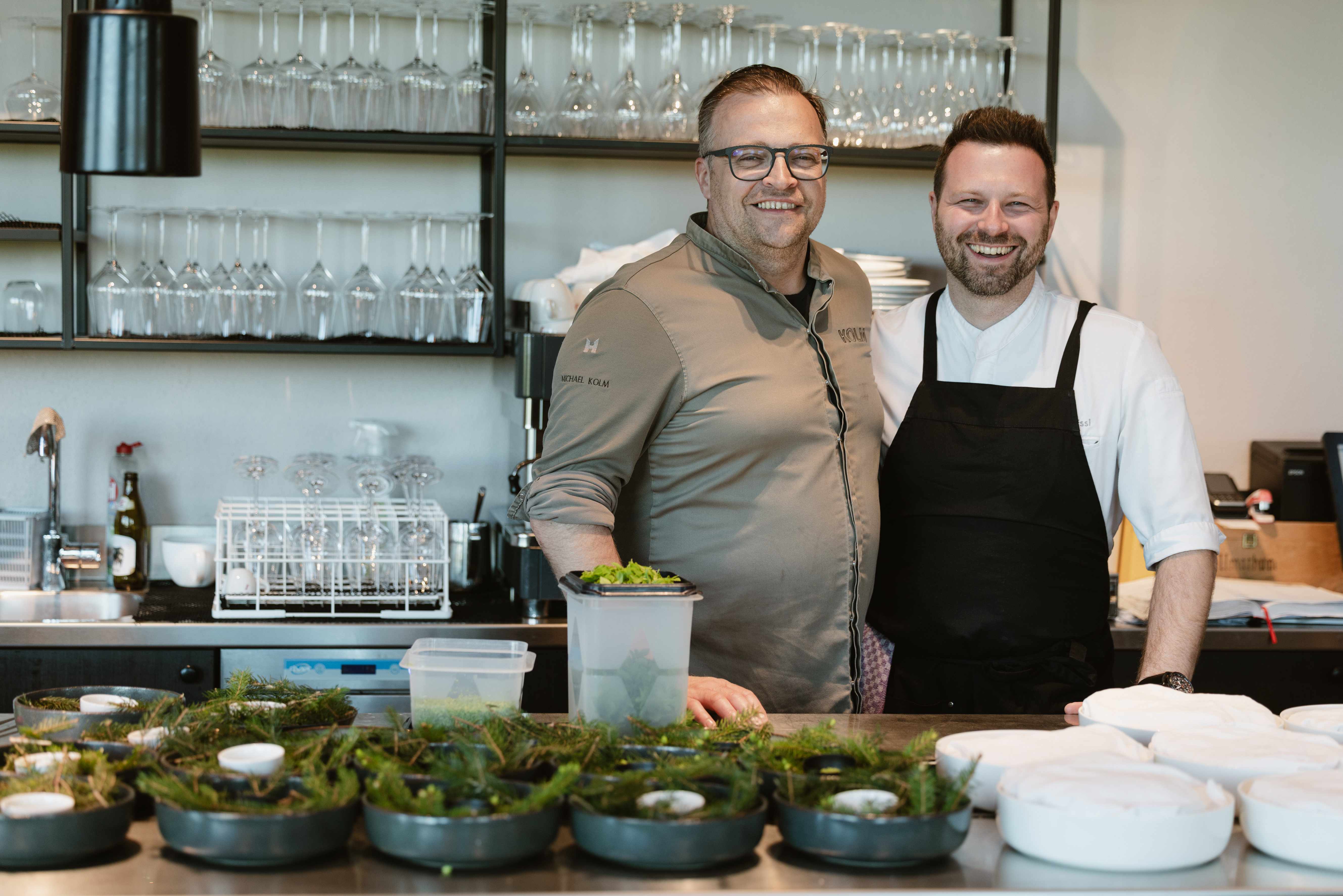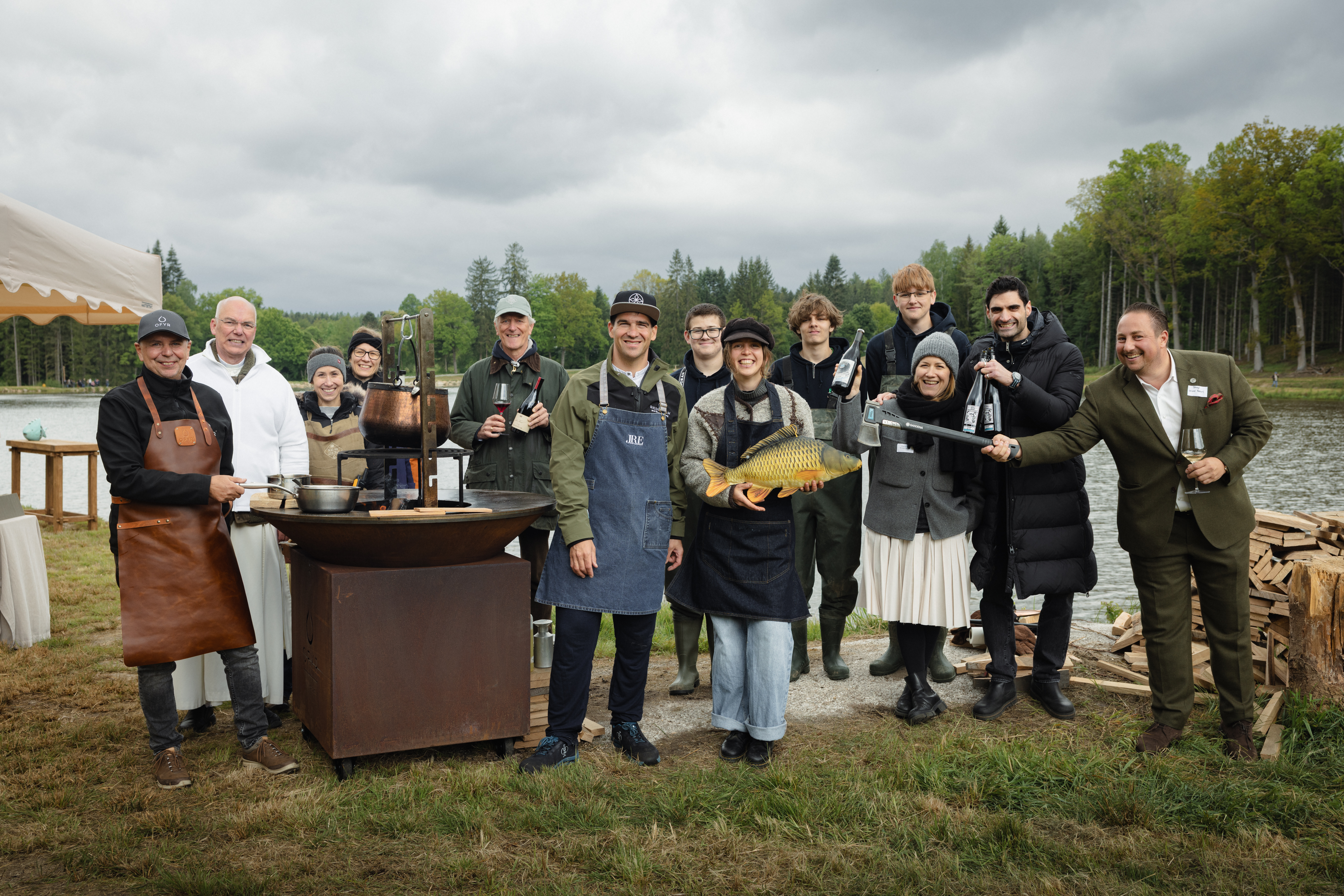 Sternekoch Andreas Herbst vom Restaurant dahoam in der Pinzgauer Riederalm servierte zwei Gänge: Zum einen am OFYR zubereitete Karpfen-Bosna mit fermentiertem Paprika und Sauerampfer – fein abgestimmt mit edlen Tropfen der Weingüter Heinrich und Sattler. Zum anderen ein Karpfengulasch mit Miniroggenspätzle, Zwiebelmarmelade und Wildkräutersalat. Begleitet vom Weingut Ott und einem Kalterersee Keil 2023 vom Südtiroler Weingut Manincor.