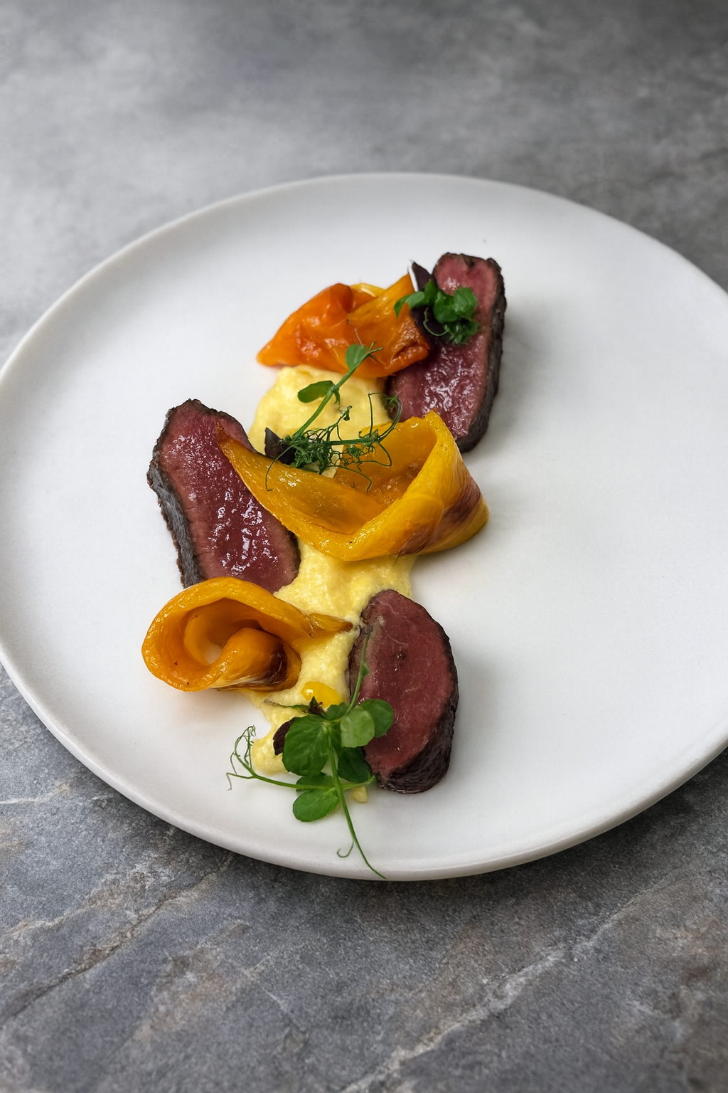 Michiel Van den Berg zeichnet für die aromenreiche Symbiose aus alpiner Kochkunst und asiatischem Touch verantwortlich. Dabei stellt er raffiniert den Eigengeschmack der sorgfältig ausgewählten Produkte in den Mittelpunkt. Eines seiner Signature Dishes ist Rehrücken gebraten an Sellerie-Misocreme mit geröstetem Paprika und Kresse.