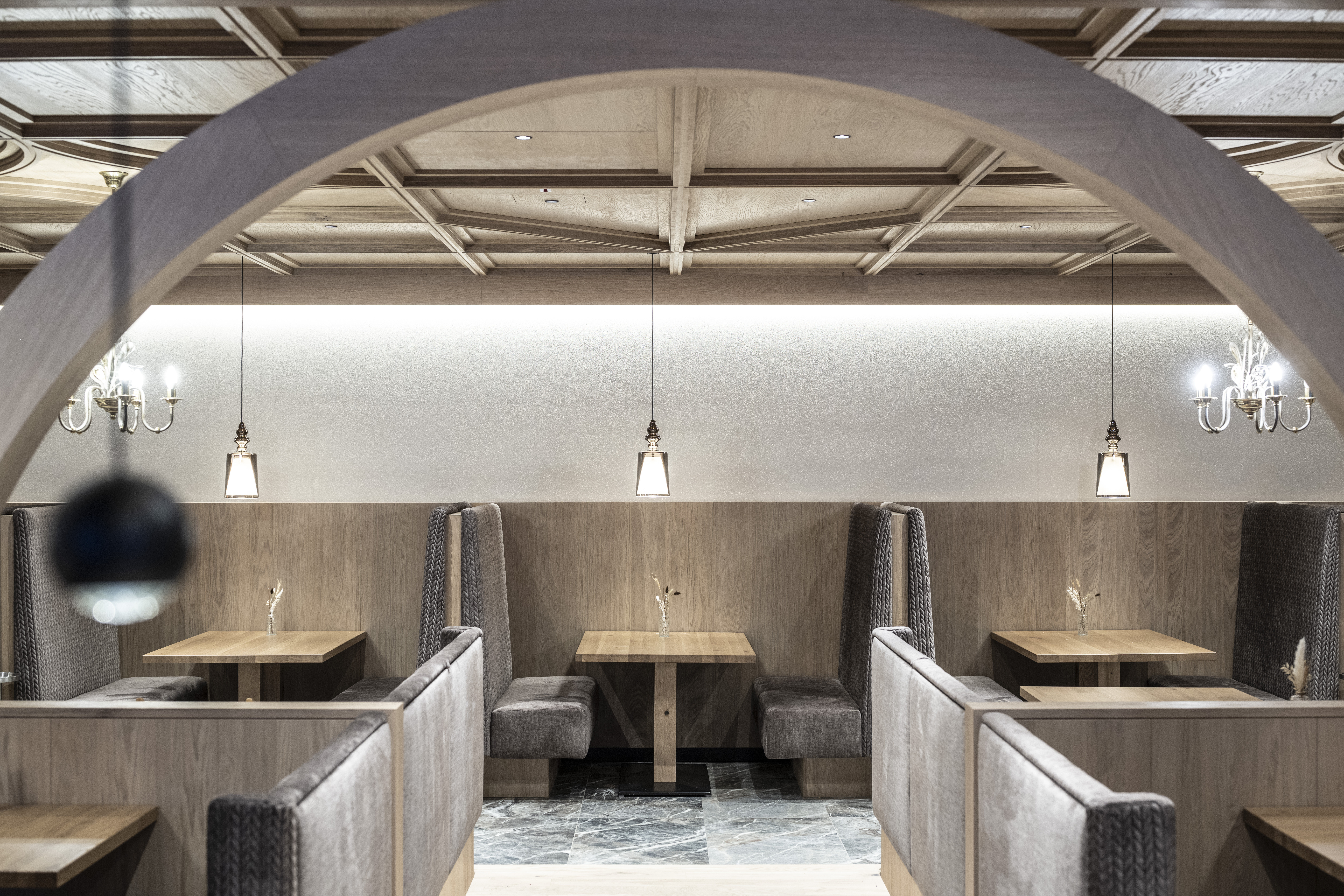 Das Frühstück sorgt mit Südtiroler-Köstlichkeiten für den perfekten Start in den Morgen, mittags lädt ein leichtes Buffet, nachmittags süße und herzhafte Genüsse zum Naschen. Abends feiern Foodies beim 5‑ bis 7‑Gänge‑Menü die Verbindung von bodenständiger Herkunft und kulinarischer Finesse. Ob mit einem kühlen Drink und Buch in der Bibliothek oder mit einem Glas Whisky an der Bar – Hauptsache good vibes only.