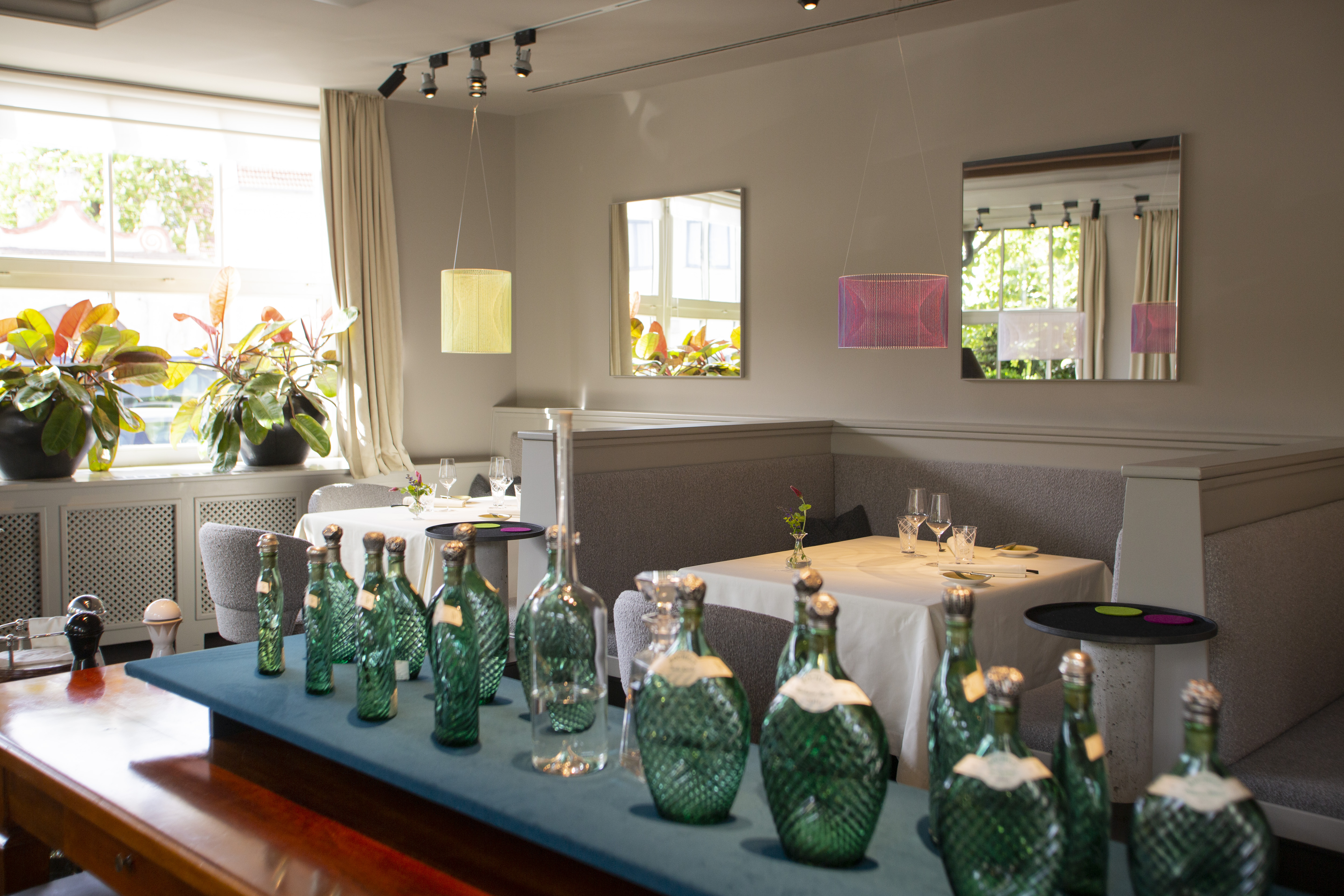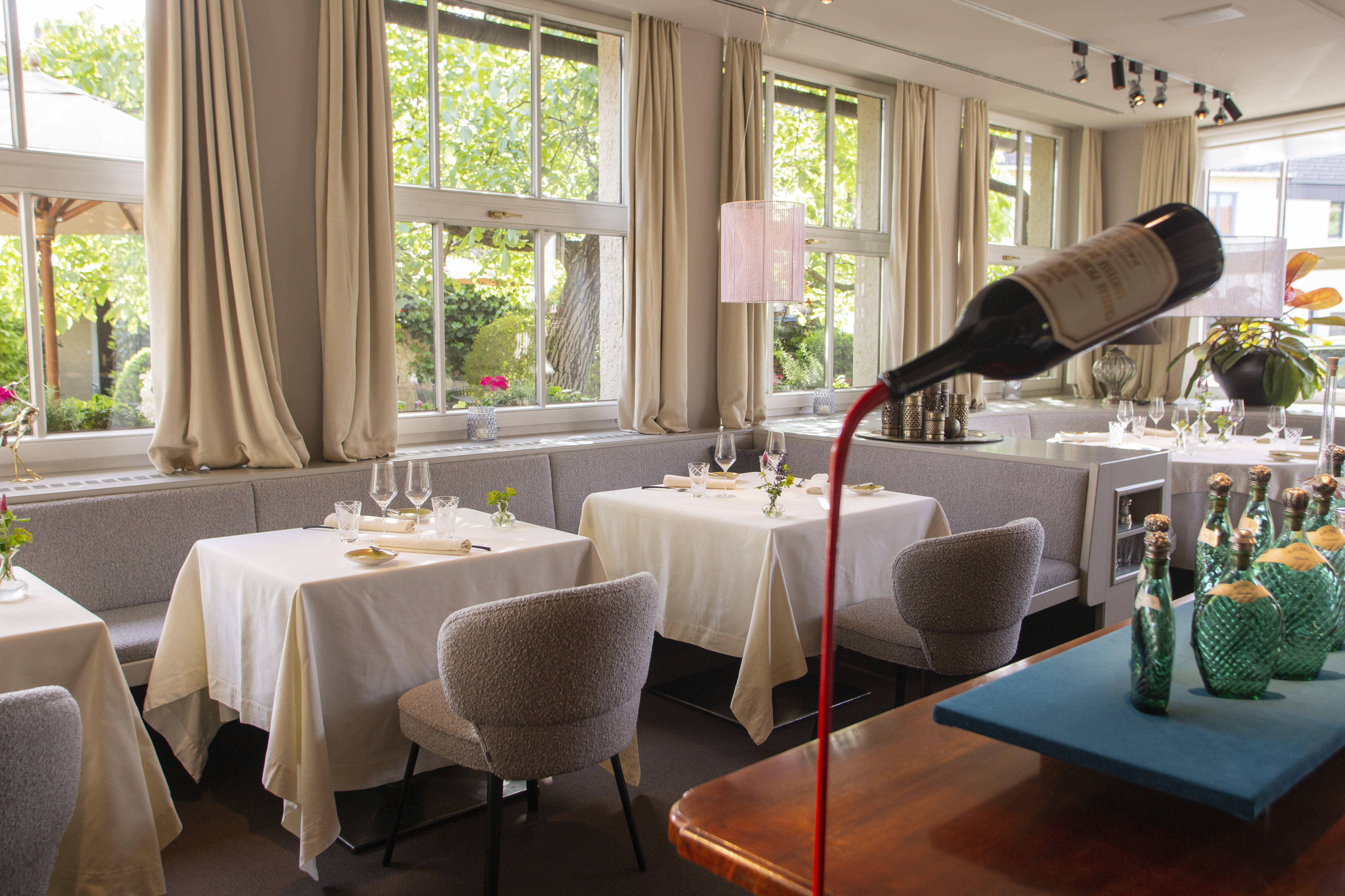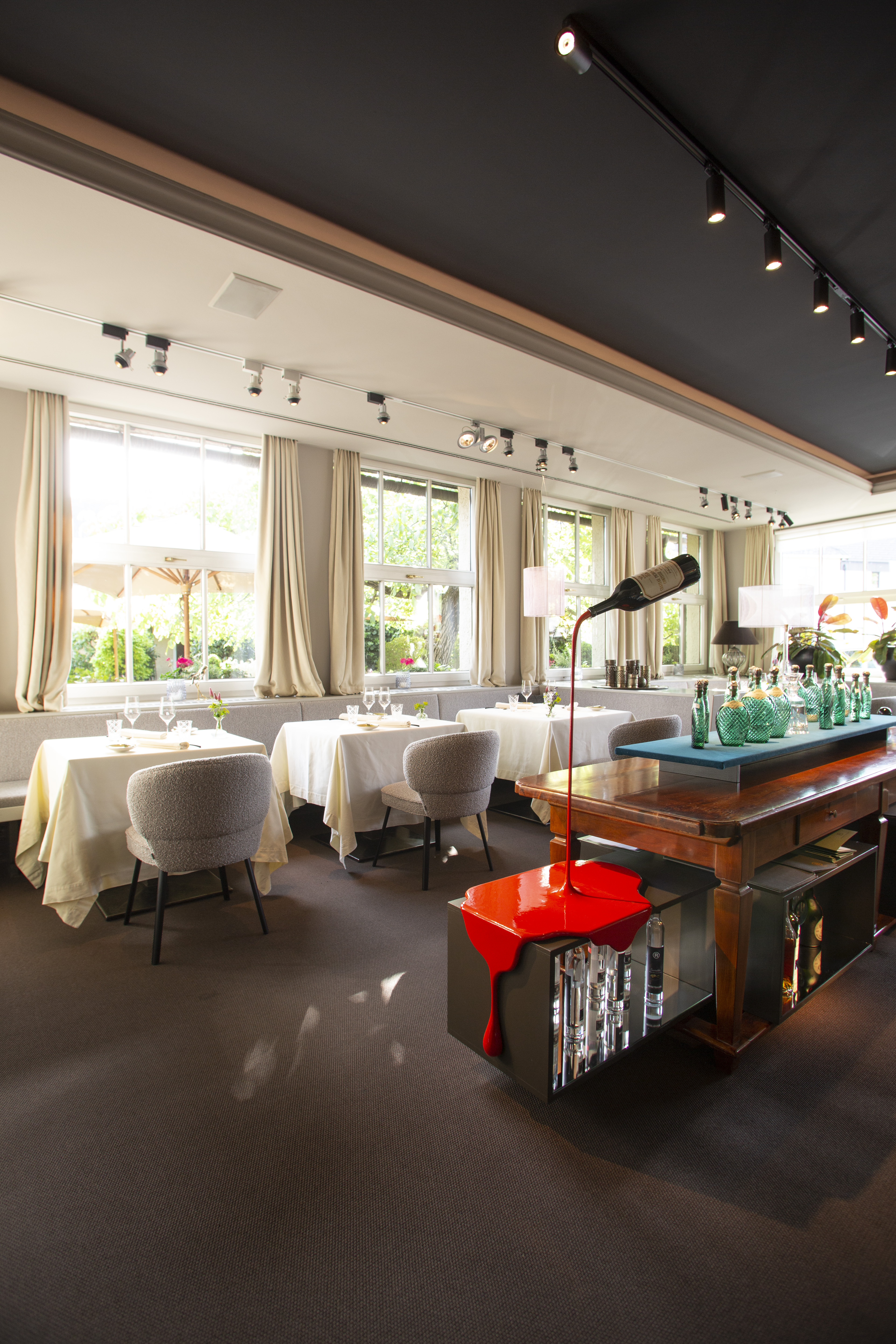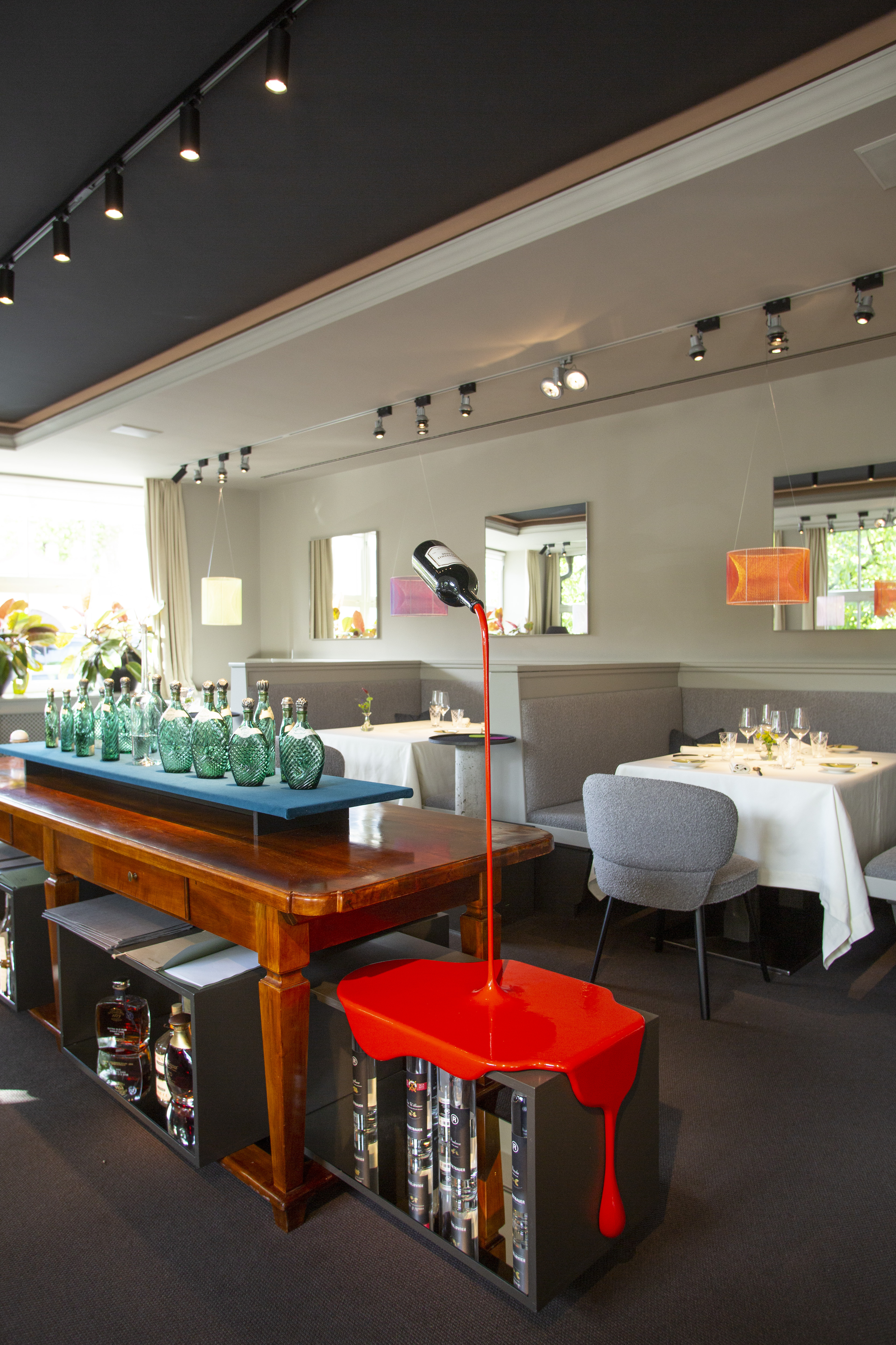 Besonders angetan haben es Susanne Dorfer-Bacher und ihrem Mann Thomas Dorfer die Gespinste von dem Vorarlberger Künstler Nikolaus Gohm. Dabei wird ein zylindrisches Metallgerüst mit farbigen Fäden in einer bestimmten Ordnung fest umspannt, wodurch die Form eines Hyperboloids entsteht. Da die Gespinste keine Leuchtmittel haben, waren die von achtsamer Hand platzierten Lichtquellen von großer Bedeutung. „Sie sind einzigartig und geben dem Raum das besondere Etwas, deswegen haben wir alles rundherum dezent gehalten“, so das Paar. Eine scheinbar schwebende Weinflasche des oberösterreichischen Künstlers Markus Hofer stellt als Kunstobjekt die Verbindung zum Wein, der schon immer einen wichtigen Stellenwert im Landhaus Bacher hatte, her. „Es handelt sich um einen Wein des Lieblings-Châteaus von meinem Vater mit meinem Jahrgang“, so die Sommelière Susanne Dorfer-Bacher.