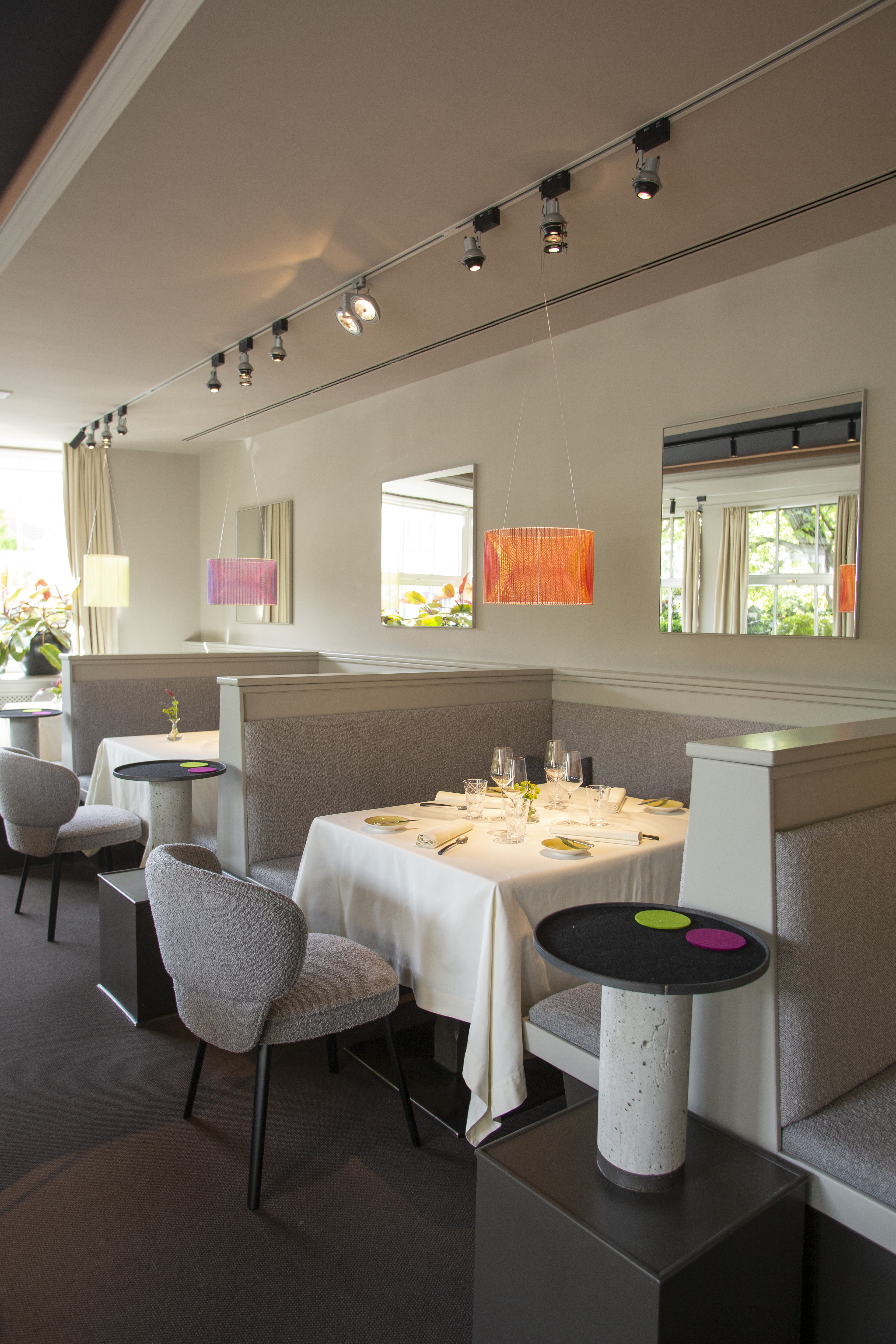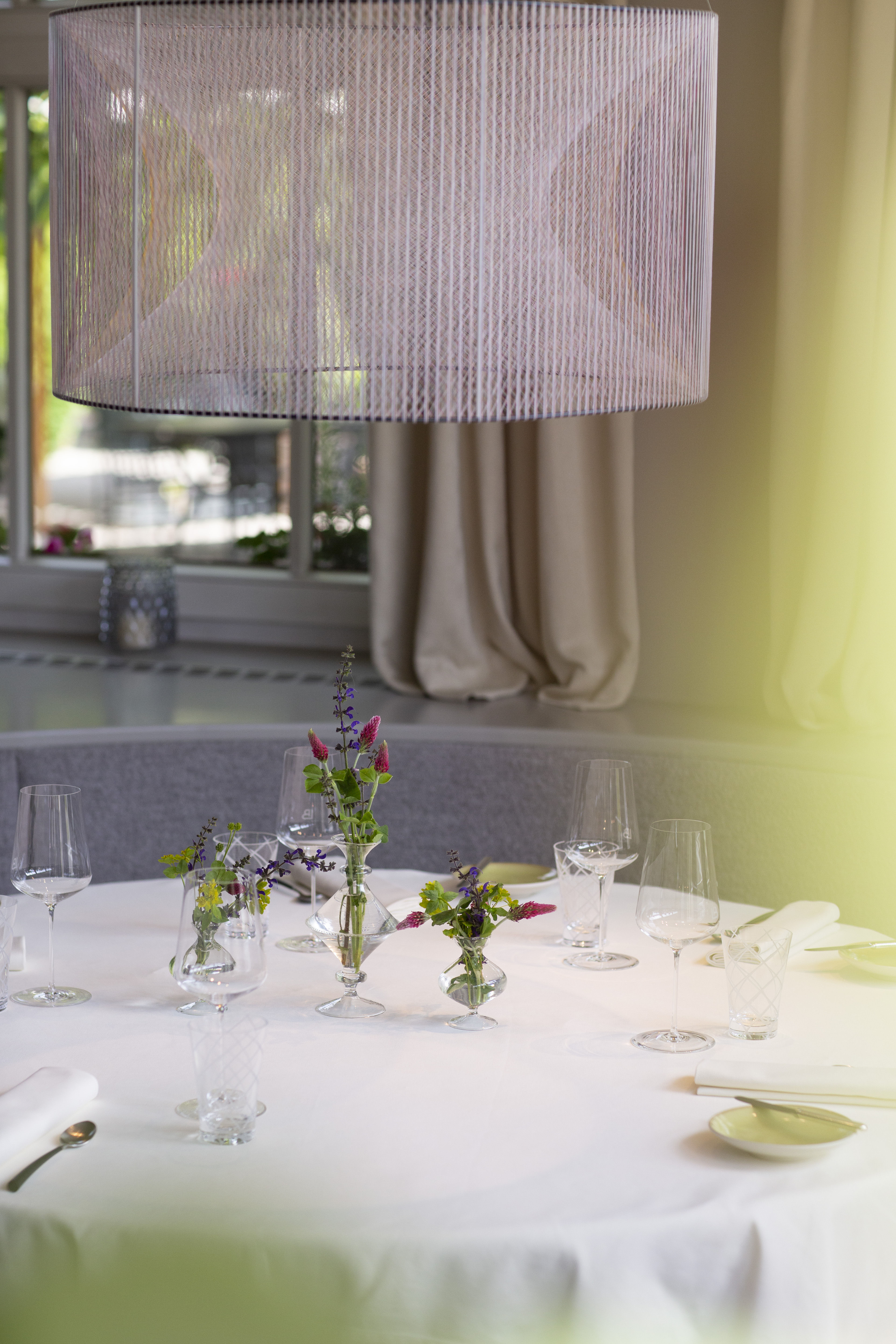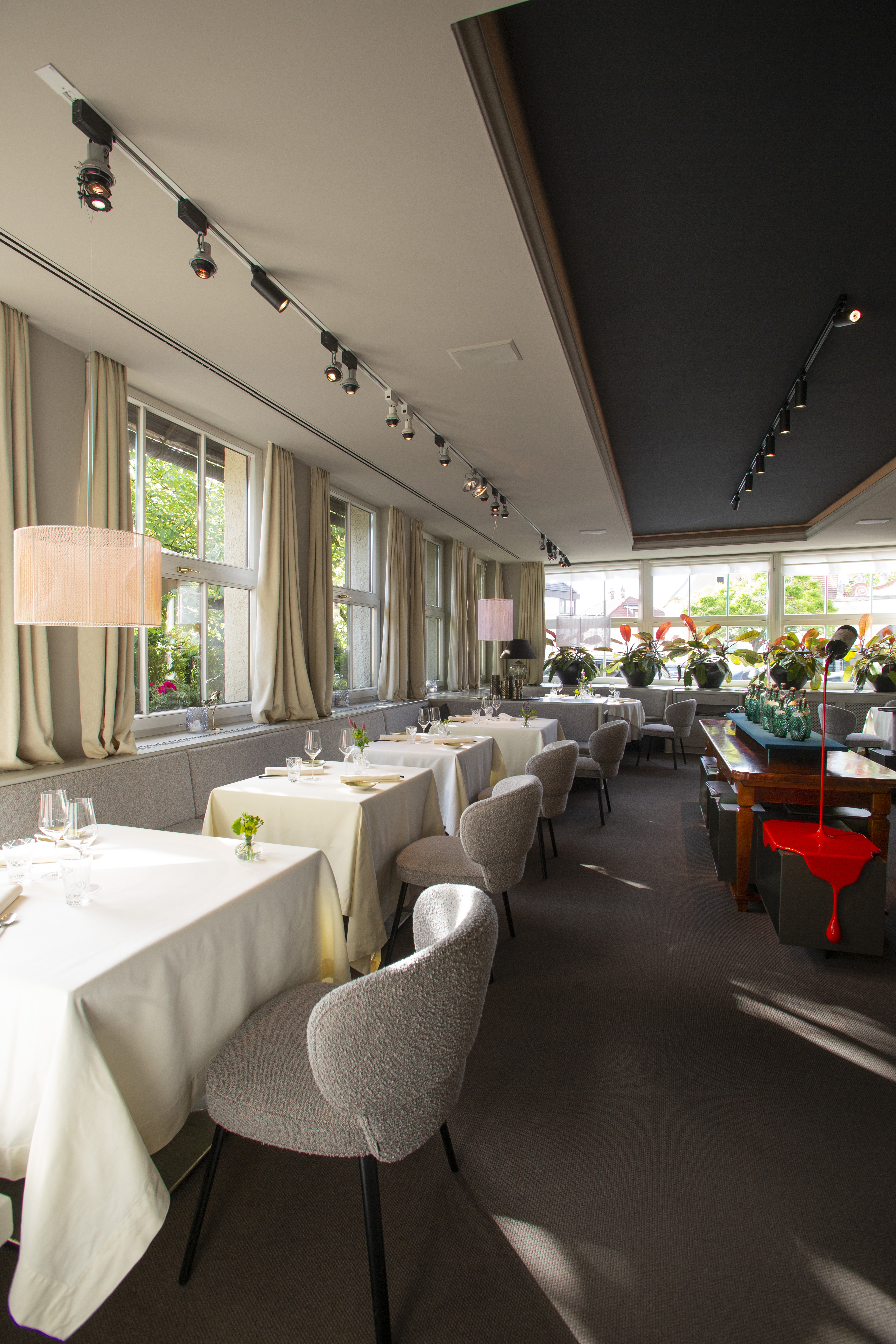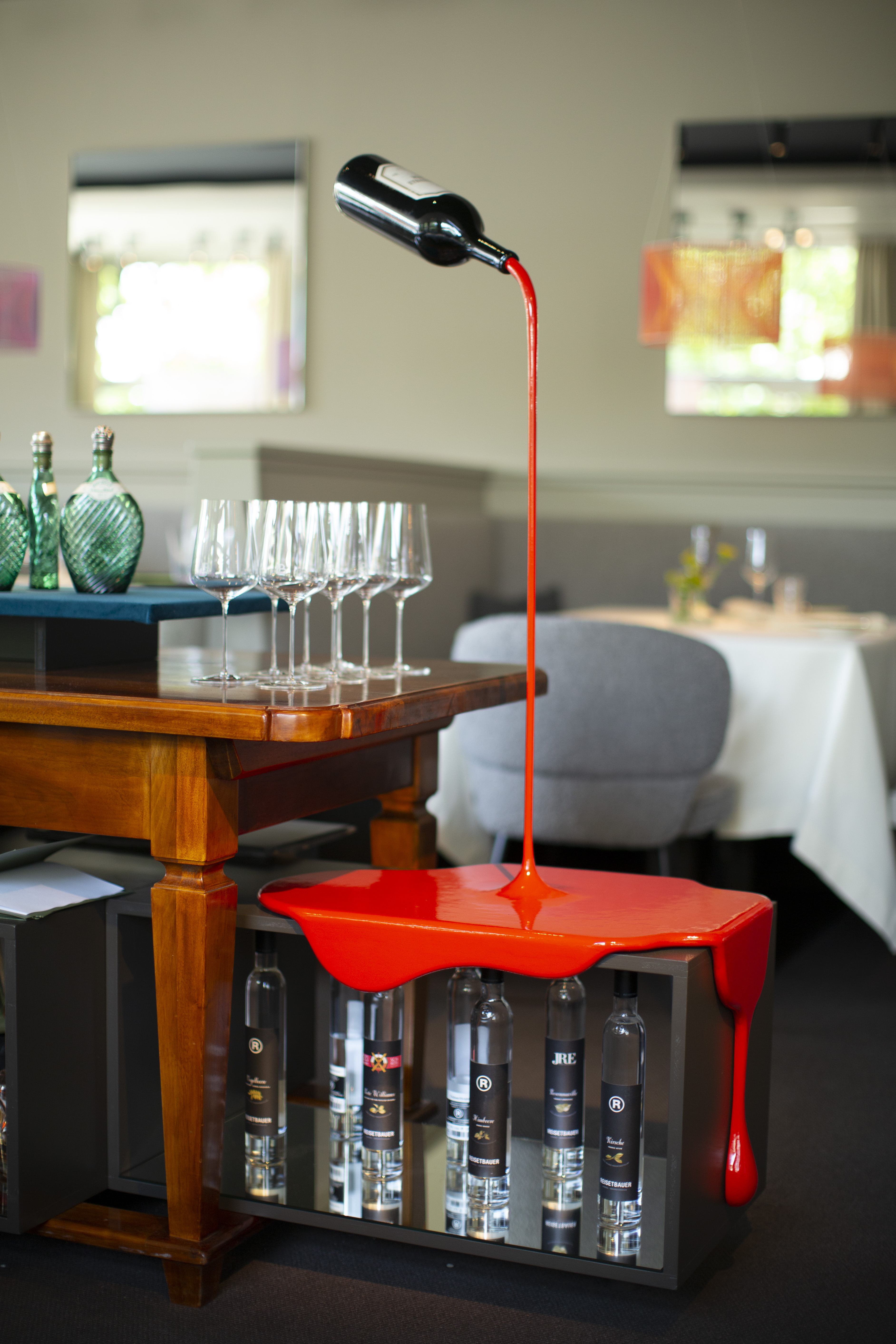 Besonders angetan haben es Susanne Dorfer-Bacher und ihrem Mann Thomas Dorfer die Gespinste von dem Vorarlberger Künstler Nikolaus Gohm. Dabei wird ein zylindrisches Metallgerüst mit farbigen Fäden in einer bestimmten Ordnung fest umspannt, wodurch die Form eines Hyperboloids entsteht. Da die Gespinste keine Leuchtmittel haben, waren die von achtsamer Hand platzierten Lichtquellen von großer Bedeutung. „Sie sind einzigartig und geben dem Raum das besondere Etwas, deswegen haben wir alles rundherum dezent gehalten“, so das Paar. Eine scheinbar schwebende Weinflasche des oberösterreichischen Künstlers Markus Hofer stellt als Kunstobjekt die Verbindung zum Wein, der schon immer einen wichtigen Stellenwert im Landhaus Bacher hatte, her. „Es handelt sich um einen Wein des Lieblings-Châteaus von meinem Vater mit meinem Jahrgang“, so die Sommelière Susanne Dorfer-Bacher.