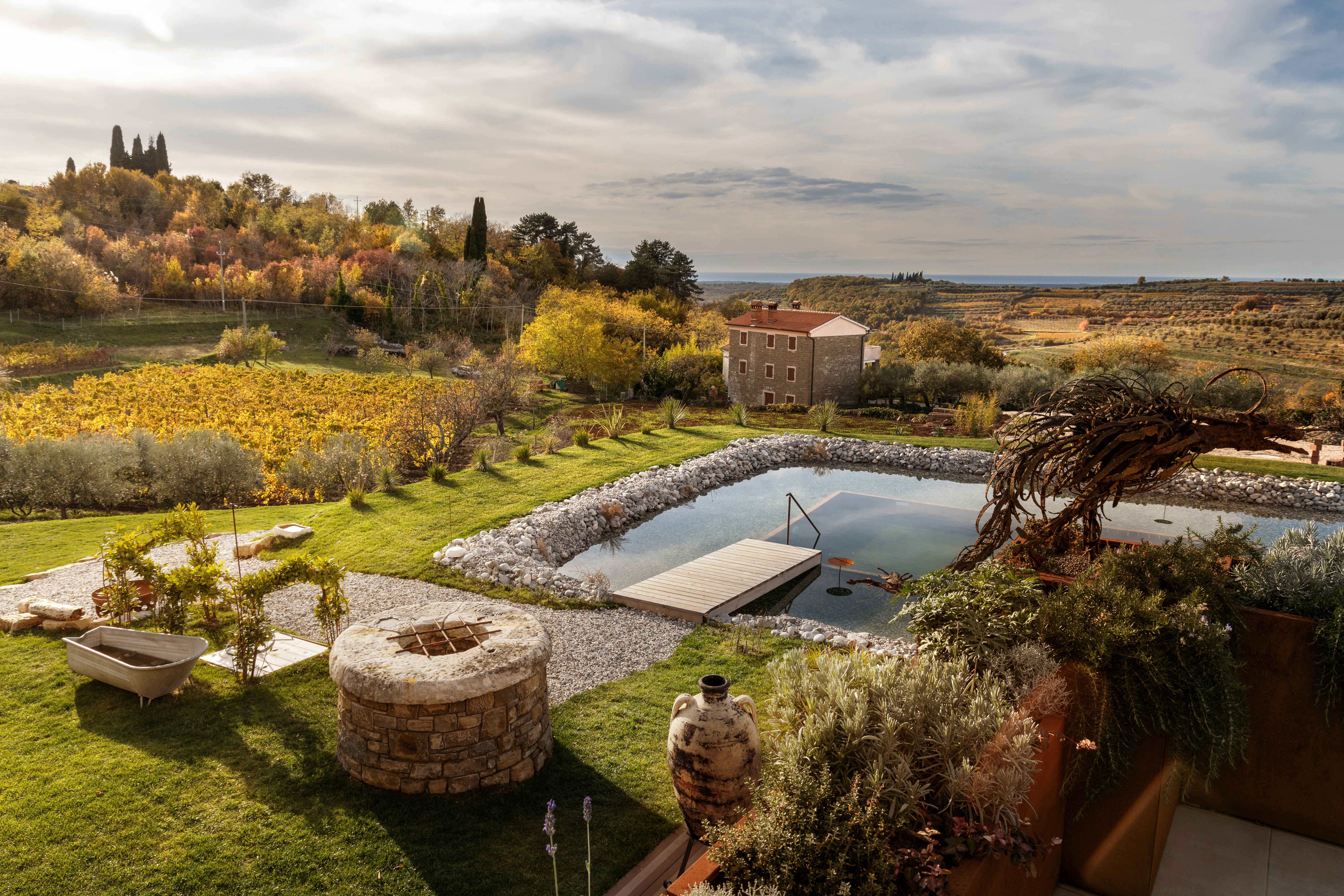 Viele kleine Köstlichkeiten regionaler Produzenten prägen das – auf Wunsch buchbare – Frühstück, das am großen Esstisch im Wohnsalon und auf der Panoramaterrasse serviert wird. Immer mit Blick über den von einer eigenen Quelle gespeisten und mit Salzdialyse betriebenen Naturpool (12 x 5 m, Loungebetten) und das sanfte Hügelland bis zur Adria in der Ferne, bei klarer Sicht sogar bis Venedig.