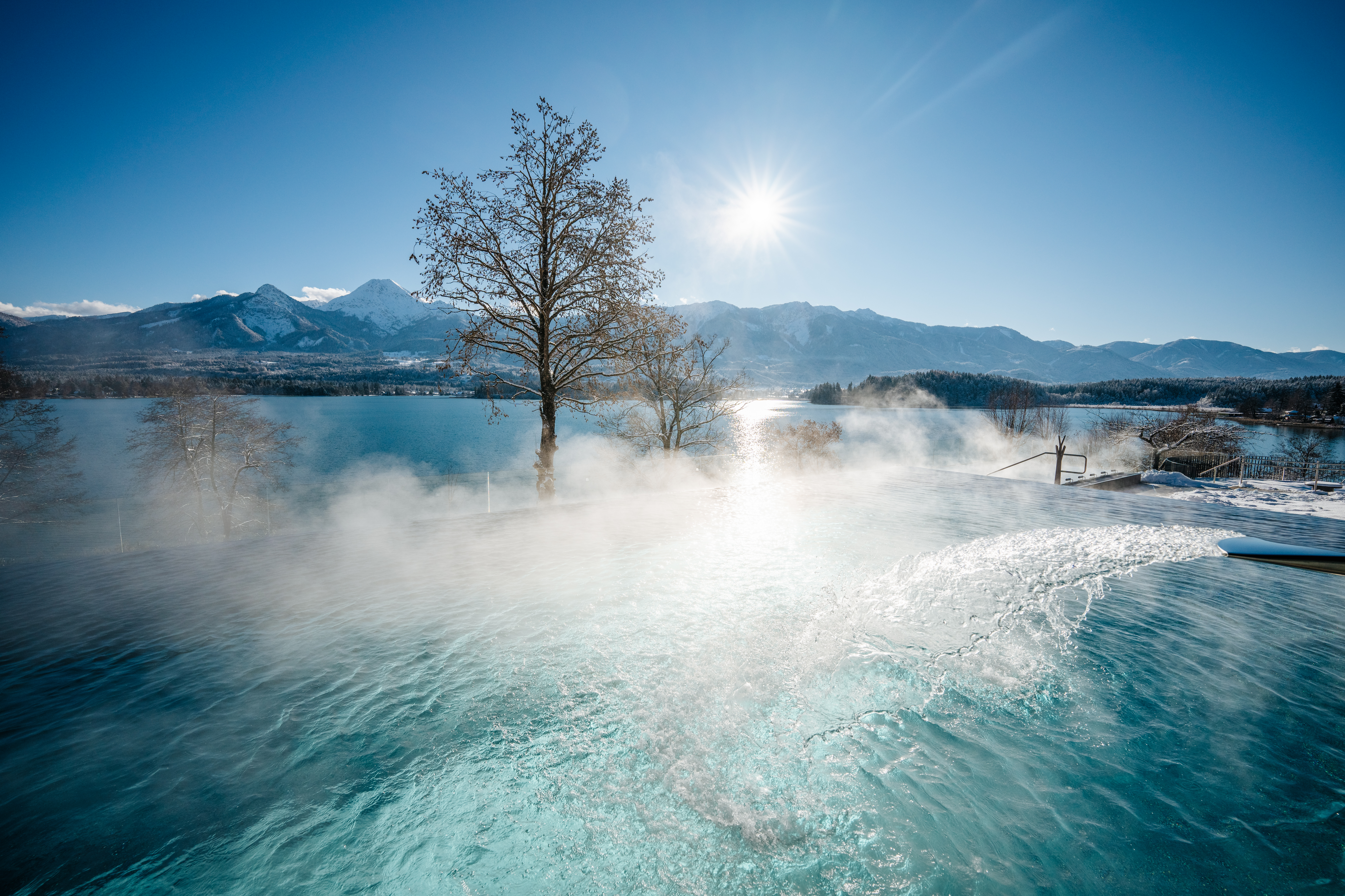 Der Blick schweift über den Faaker See bis zu den Karawanken – im Karnerhof war diese Aussicht schon immer besonders und allgegenwärtig, jetzt ist sie auch Herzstück des neuen Lichtquelle-Spa. Vier Millionen Euro flossen in den Umbau, um genau das zu schaffen: einen Ort, wo Landschaft und Wellness verschmelzen. Das lichtdurchflutete Hallenbad, die erweiterte Saunalandschaft, der Salzraum – überall rahmen bodentiefe Fenster den See ein. Im Infinitypool verschwimmt die Grenze zwischen Wasser und Horizont, hier stellt sich die innere Balance wie von selbst ein.
