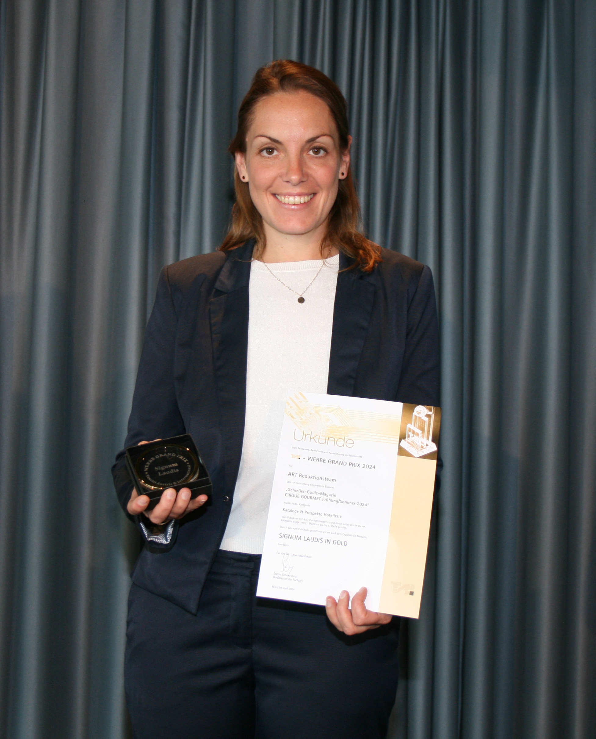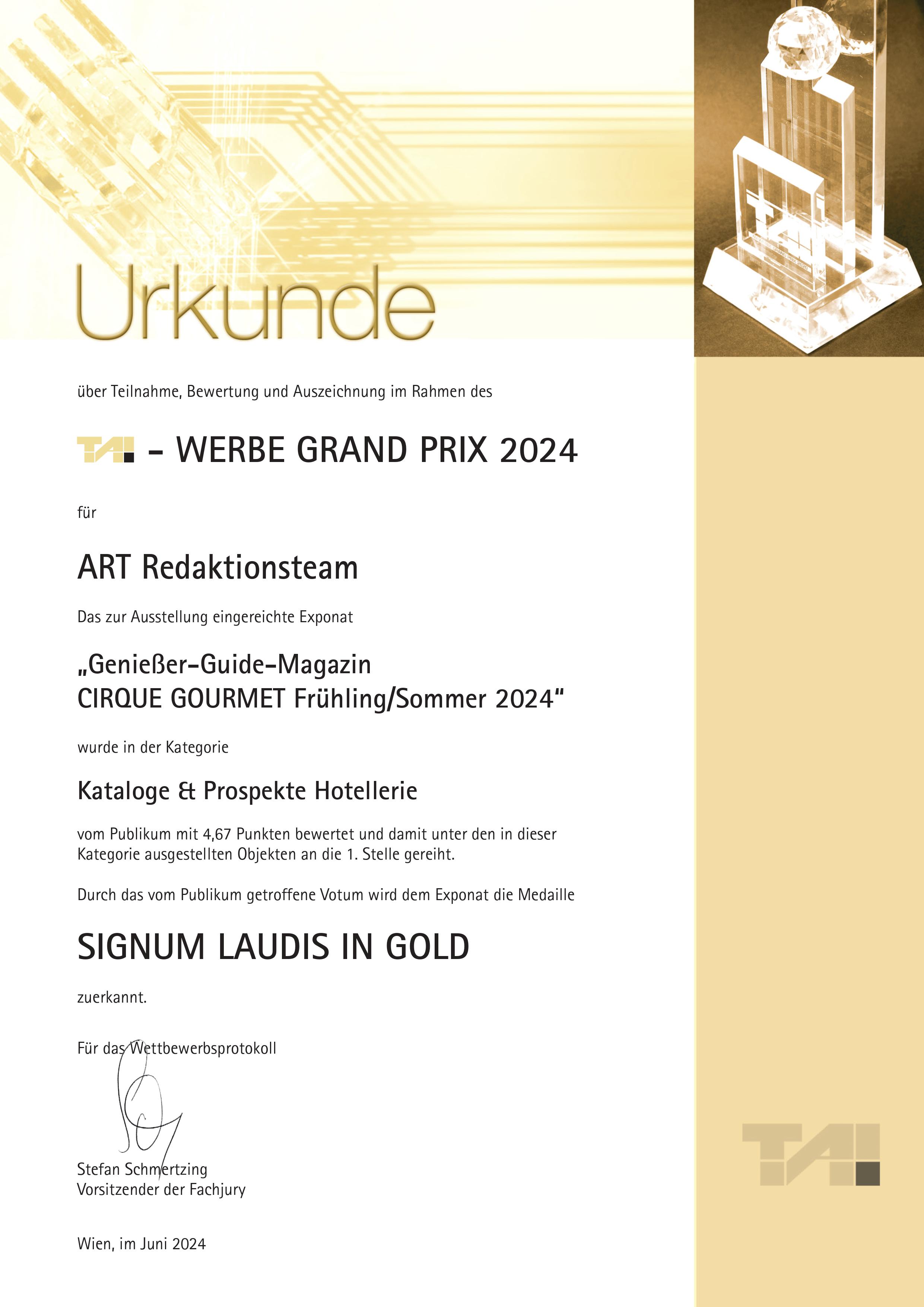 Eindrucksvoller Erfolg für die Genießerhotels & -restaurants (www.geniesserhotels.com). Das von der Salzburger Tourismus-PR-Agentur A.R.T. RedaktionsTeam zweimal jährlich produzierte Genießer-Guide-Magazin CIRQUE GOURMET „Frühling/Sommer 2024“ gewann für seine innovative Marketingkonzeption den am 12.6.2024 in Wien verliehenen T.A.I. Werbe Grand Prix 2024 in Gold in der Kategorie „Kataloge & Prospekte Hotellerie“.