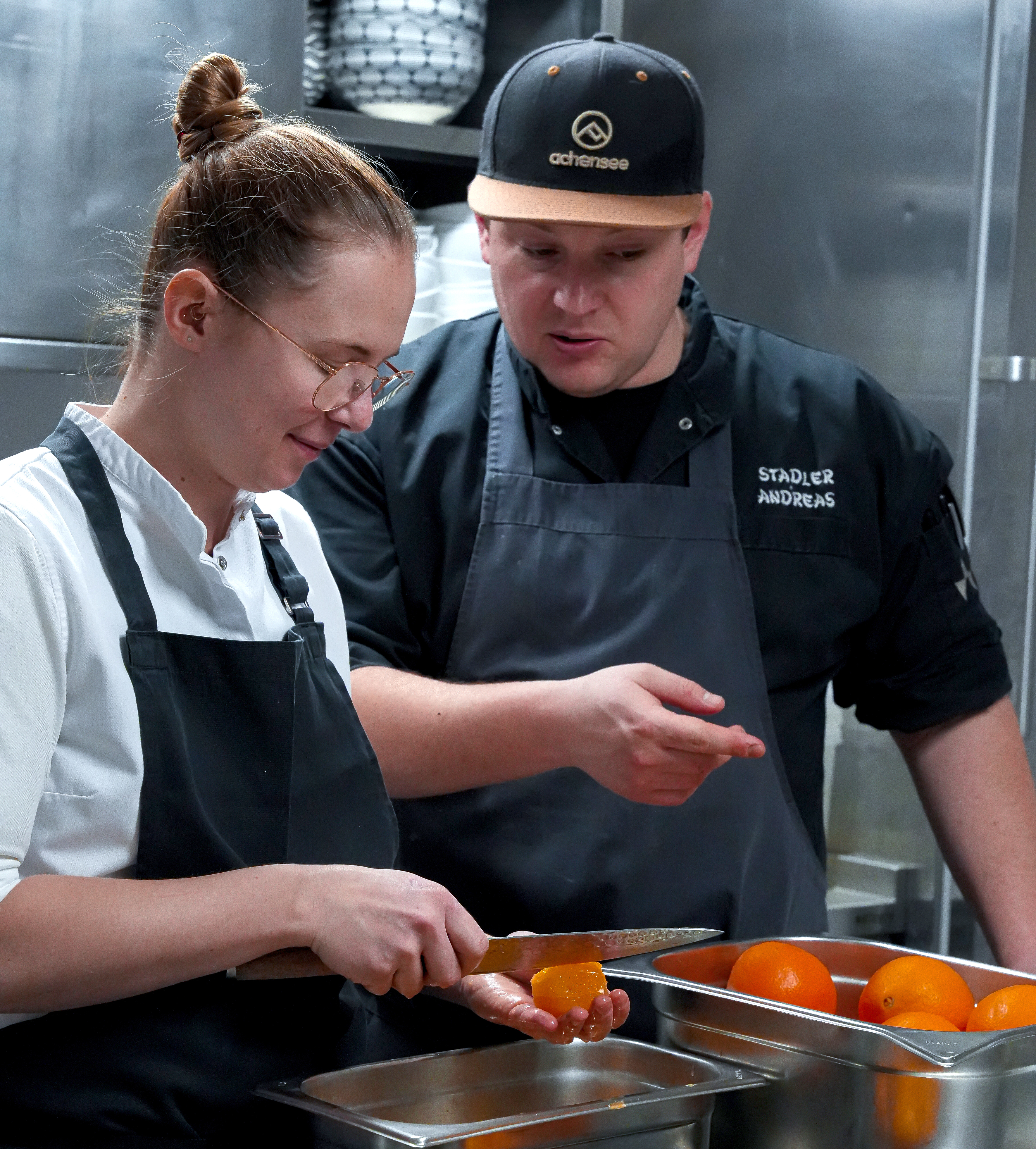 Andreas’ wichtigste Station war seine Lehradresse, wie er heute sagt – das Restaurant Goldener Hirsch in der Salzburger Getreidegasse. Als Küchenchef kochte er in Haller’s Genießerhotel im Kleinwalsertal auf Niveau von drei Hauben. Auch am Achensee im Wagnerhof und im Das Rieser hatte er das Zepter in der Küche in der Hand – um nur einige Meilensteine seiner Laufbahn zu nennen. An Erfahrung wird es den beiden also nicht fehlen.